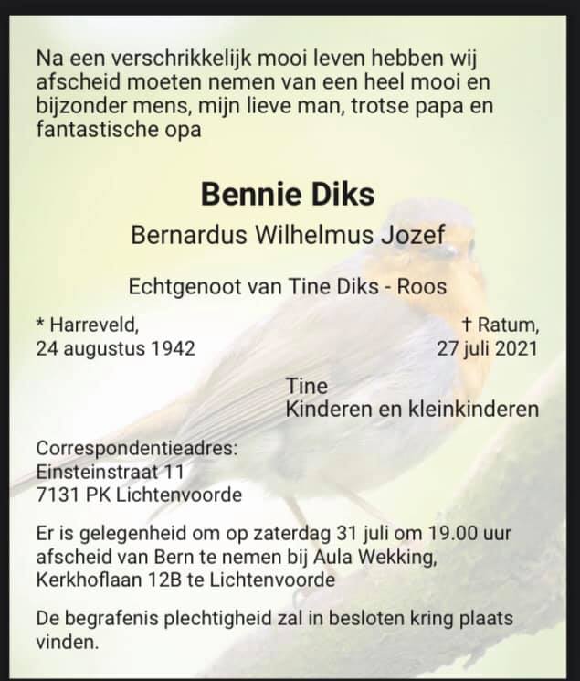 Wij wensen zijn echtgenote Tine, kinderen en kleinkinderen sterkte met dit verlies. R.I.P. Ben Diks.