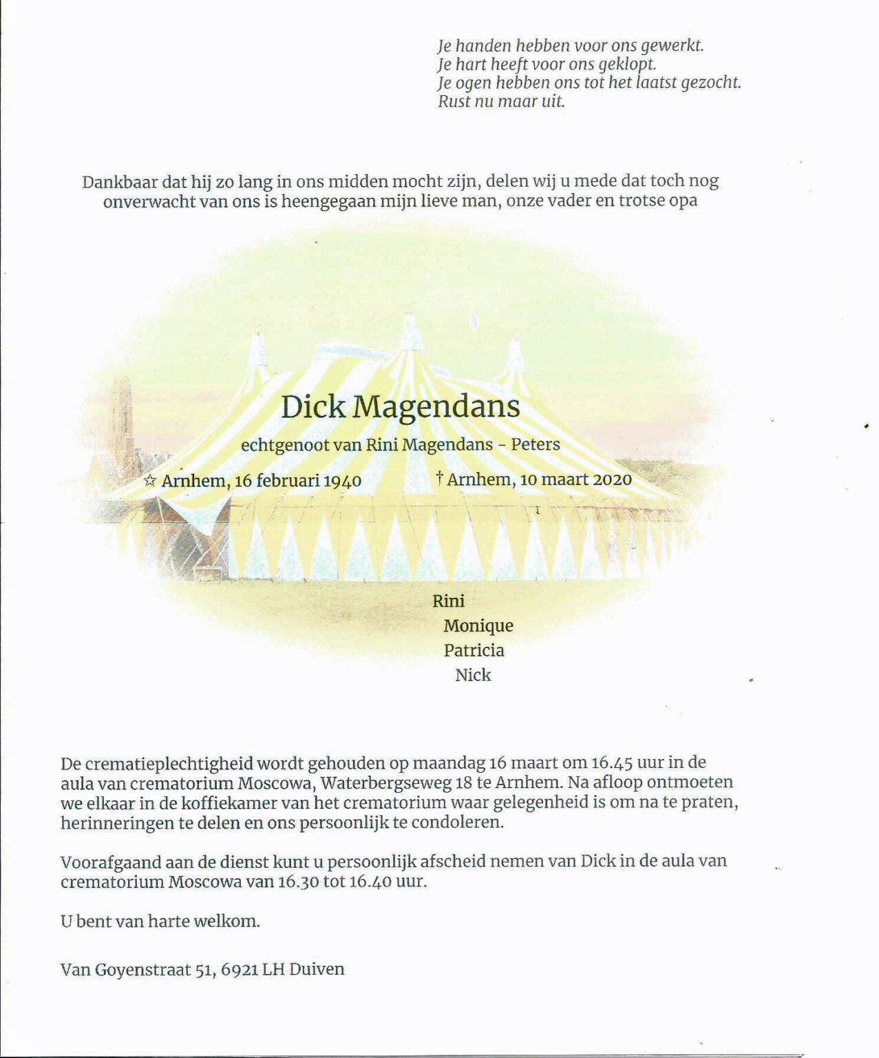 Vandaag bereikte ons het trieste bericht dat Derk Hendrik Magendans in zijn woonplaats Arnhem is overleden. Derk werd op 16 februari jongstleden 80 jaar. Derk was een circusliefhebber en circusvriend van het eerste uur. Een graag geziene gast bij de vele circussen die hij in het binnen en buitenland bezocht.