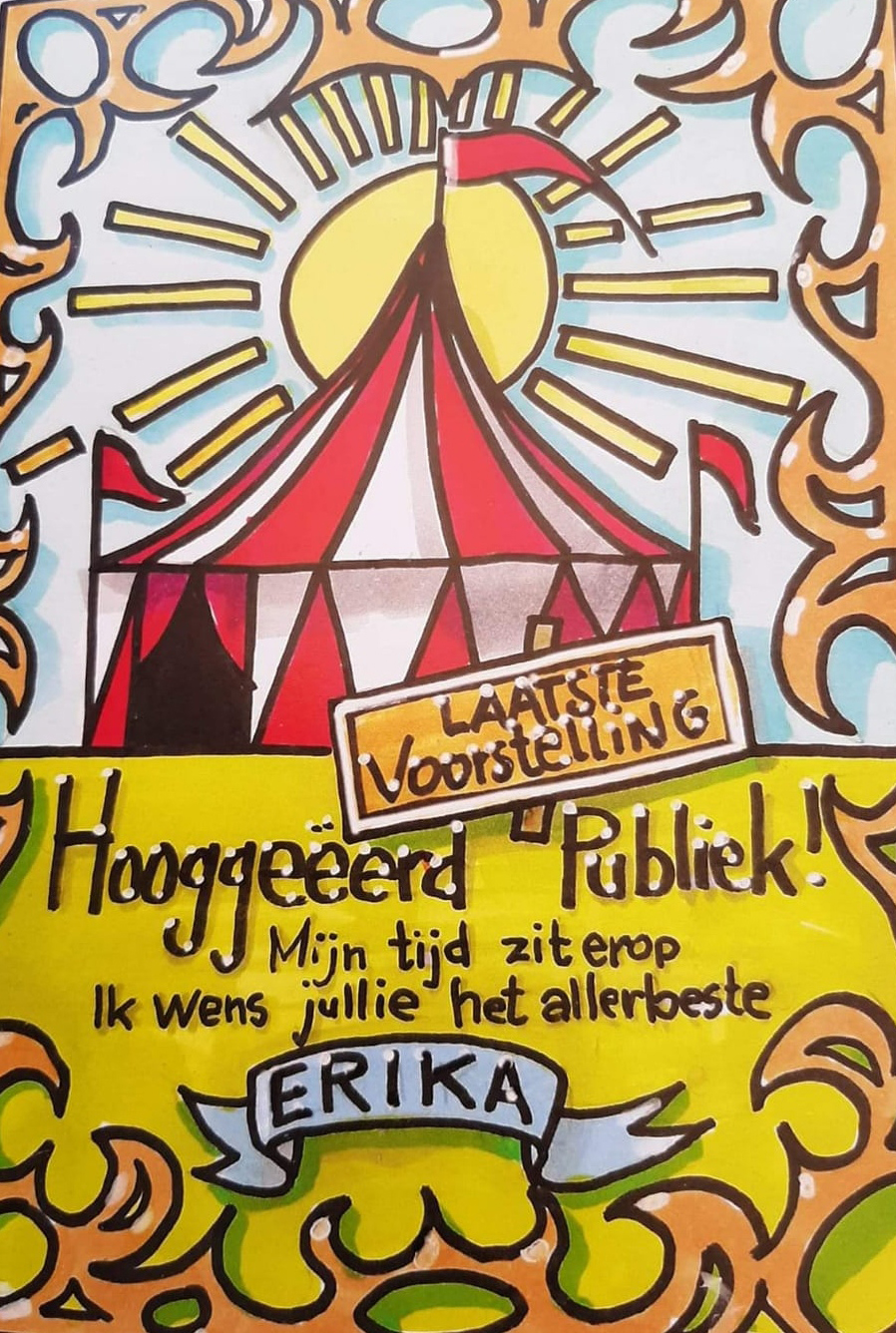 De laatste jaren werkte Erika in de verzorging, maar het circus zat nog altijd diep in haar hart, daarvan getuigd haar afscheids- kaartje. Rust zacht Erika.