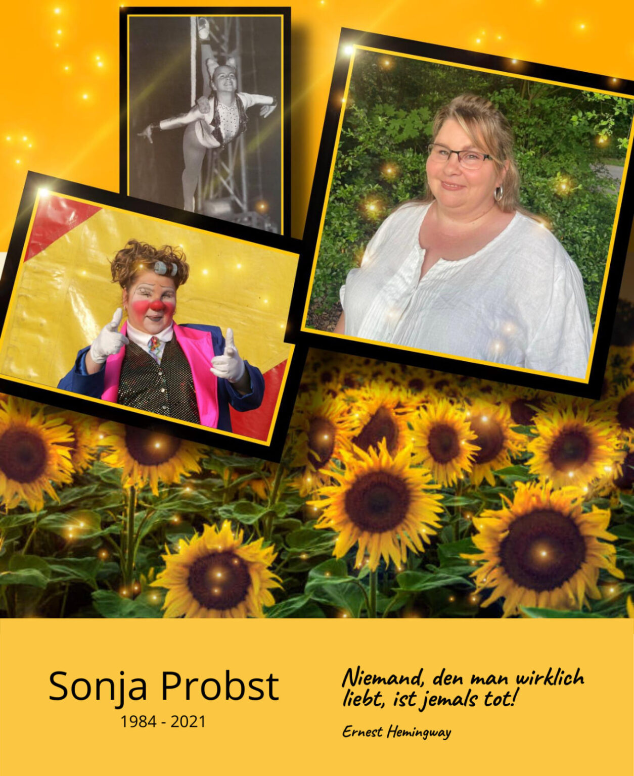 Der Circus Probst trauert um Sonja Probst. In Folge einer Komplikation bei einer Operation ist Sonja heute vollkommen unerwartet, friedlich eingeschlafen. Du warst Tochter, Schwester, Lebenspartnerin, Tante, Nichte, Cousine, beste Freundin, Kollegin und Juniorchefin. Wir werden dich nie vergessen!
