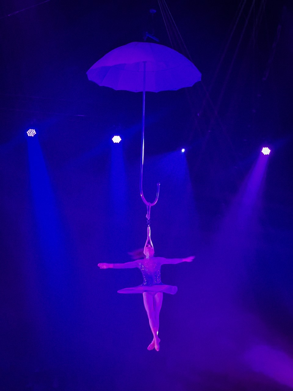 In de grote speeltent start de voorstelling met een feestelijk openingstableau met de artiesten en het ballet. Daarna schittert Elena Brukson aan twee grote rode doeken als luchtacrobate.