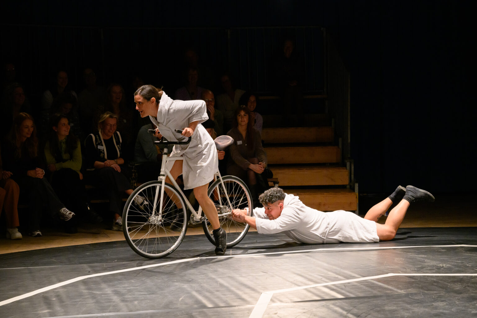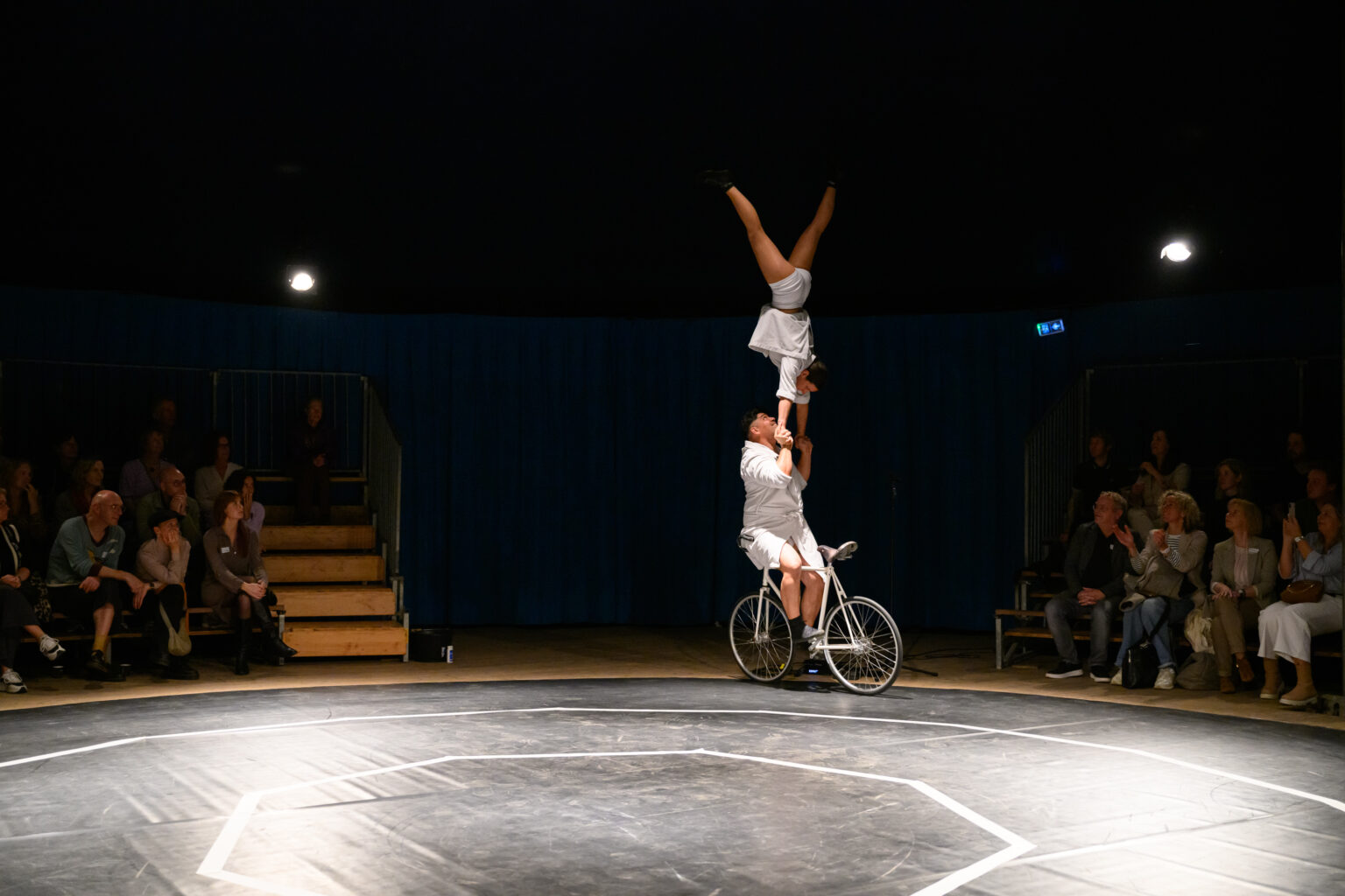 De twee acrobaten spelen in een ronde tent. Op de ronde vloer zijn met witte tape cirkels getrokken, het is een wielerparcours voor wat komen gaat. In de cirkel staat een witte fiets, op zijn kop.