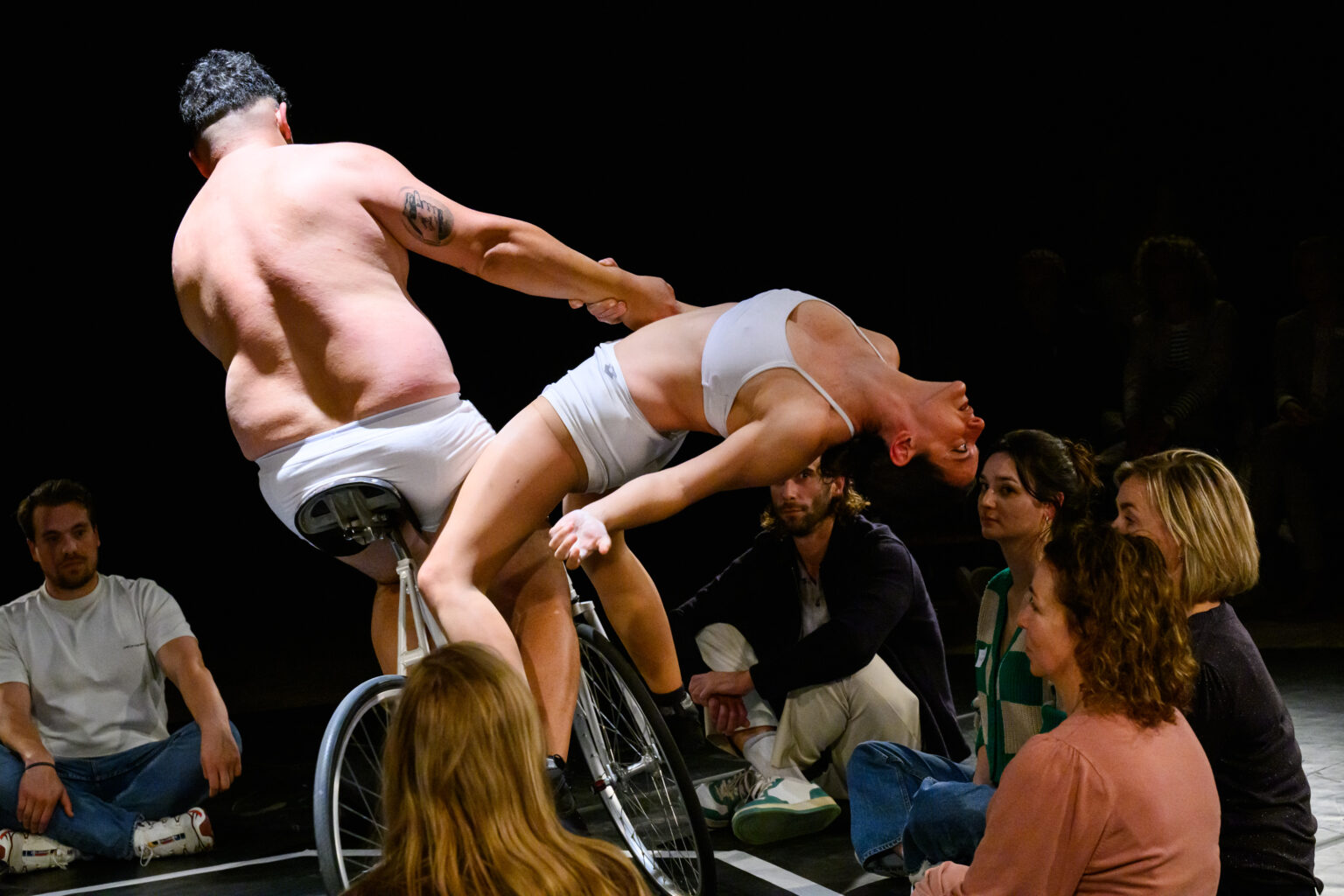 En dat aanraken is voor sommige toeschouwers letterlijk. Ze mogen in de piste op de grond gaan zitten, in een cirkel, dicht bij de rondfietsende acrobaten die op nauwelijks een halve meter voorbijrijden. De piste, de speelruimte, wordt kleiner, de intimiteit groter.