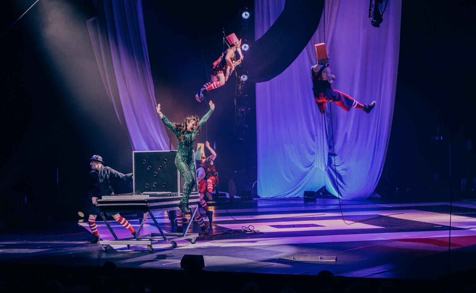 Trapeziste Saphia Loizeau werkte eerder mee aan Ashtonia. In Ahoy vliegt ze met glitterjurkje aan de swingtrapeze. Zo’n klassiek circusplaatje tussen de kunstzinnige overdaad, lijkt op een ode aan het klassieke kerstcircus-verleden van Ahoy.