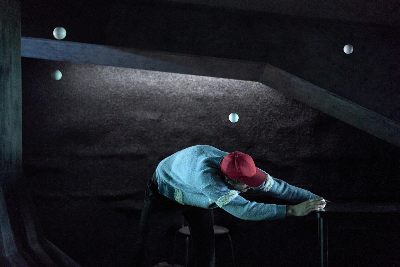 Tijdens een intermezzo beweegt de artiest dansend door de grijze ruimte. Er blijkt een balletje vast te zitten op de punt van zijn schoen en hij krijgt die bal er niet vanaf. Ineens heeft hij het publiek beet, want de bal is verdwenen. Waarheen? De kijker die er met de neus bovenop zit, tast in het duister.