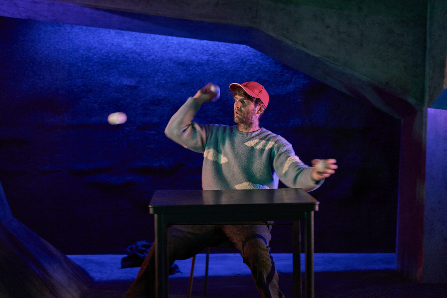 In het begin van het de voorstelling liggen die balletjes nog verspreid over de vloer. Stijn Gruppe, met petje en jasje, heeft een stofzuigerslang in zijn hand, zuigt de balletjes op en deponeert ze in een kist die op de vloer staat. In die kist vallen de ballen onmiddellijk stil, stuiteren doen ze niet.