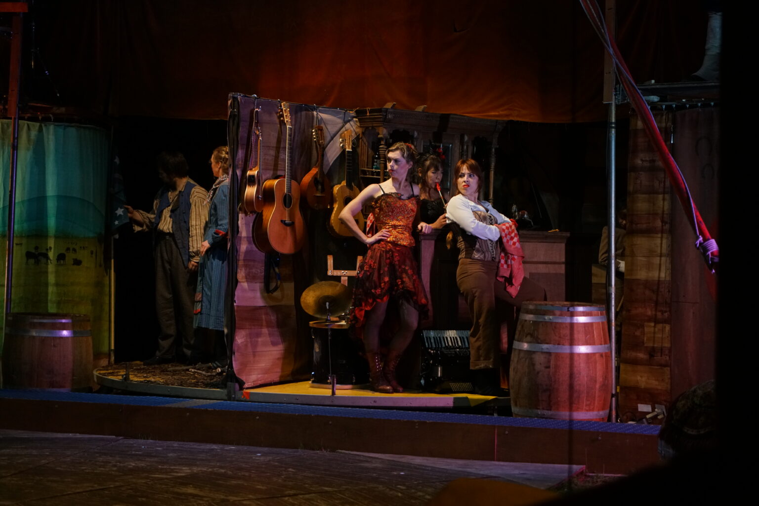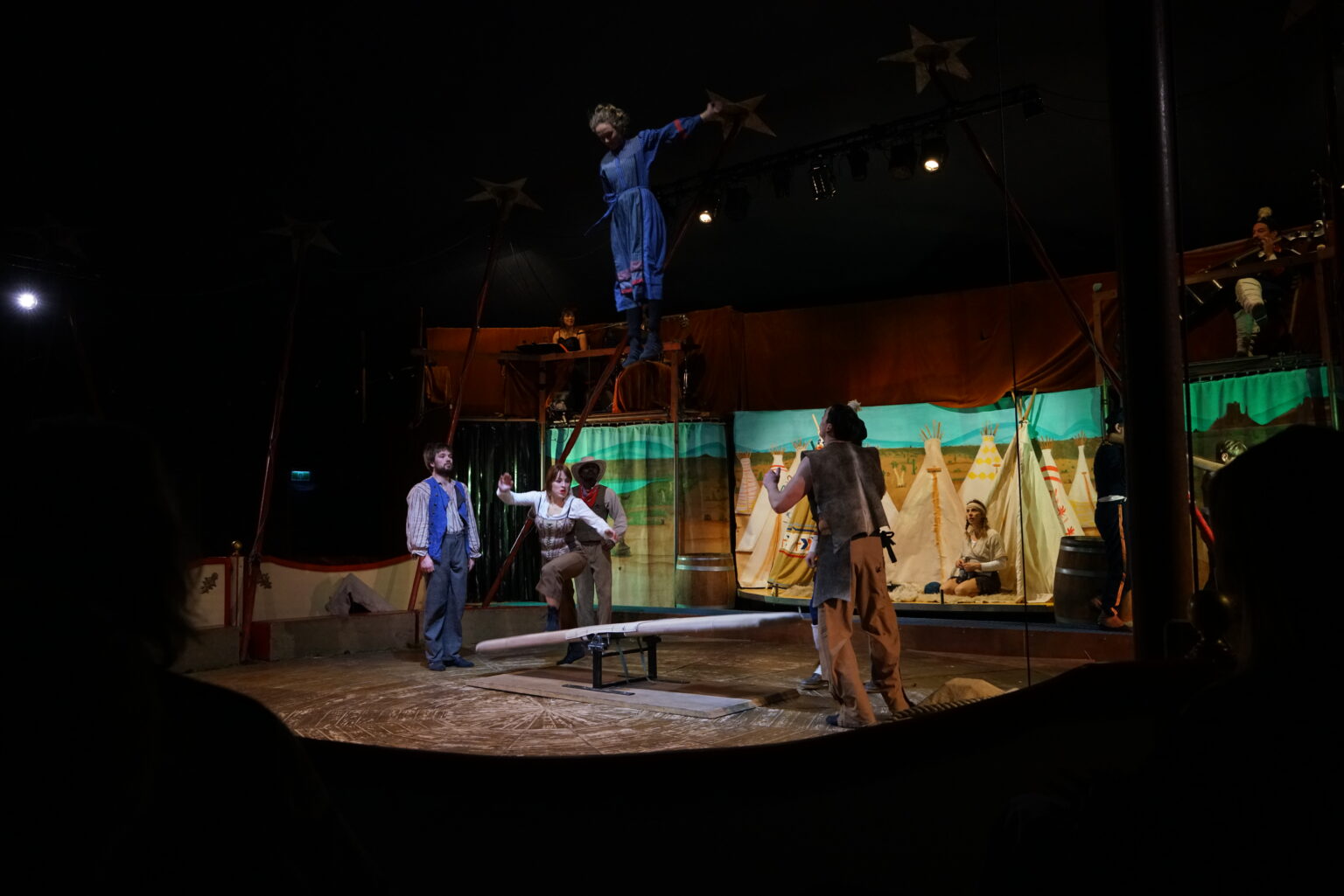 Door een draaiend decor bevindt het voorstellingsverhaal zich afwisselend in een saloon, bij een houten hutje op de prairie én op een terrein met een tipi en een grote cactus. Vlak voor de draaischijf ligt een lopende band, waarop artiesten langswandelen.