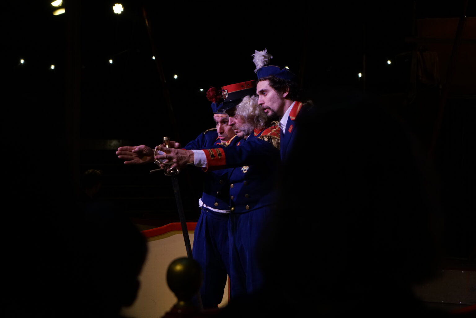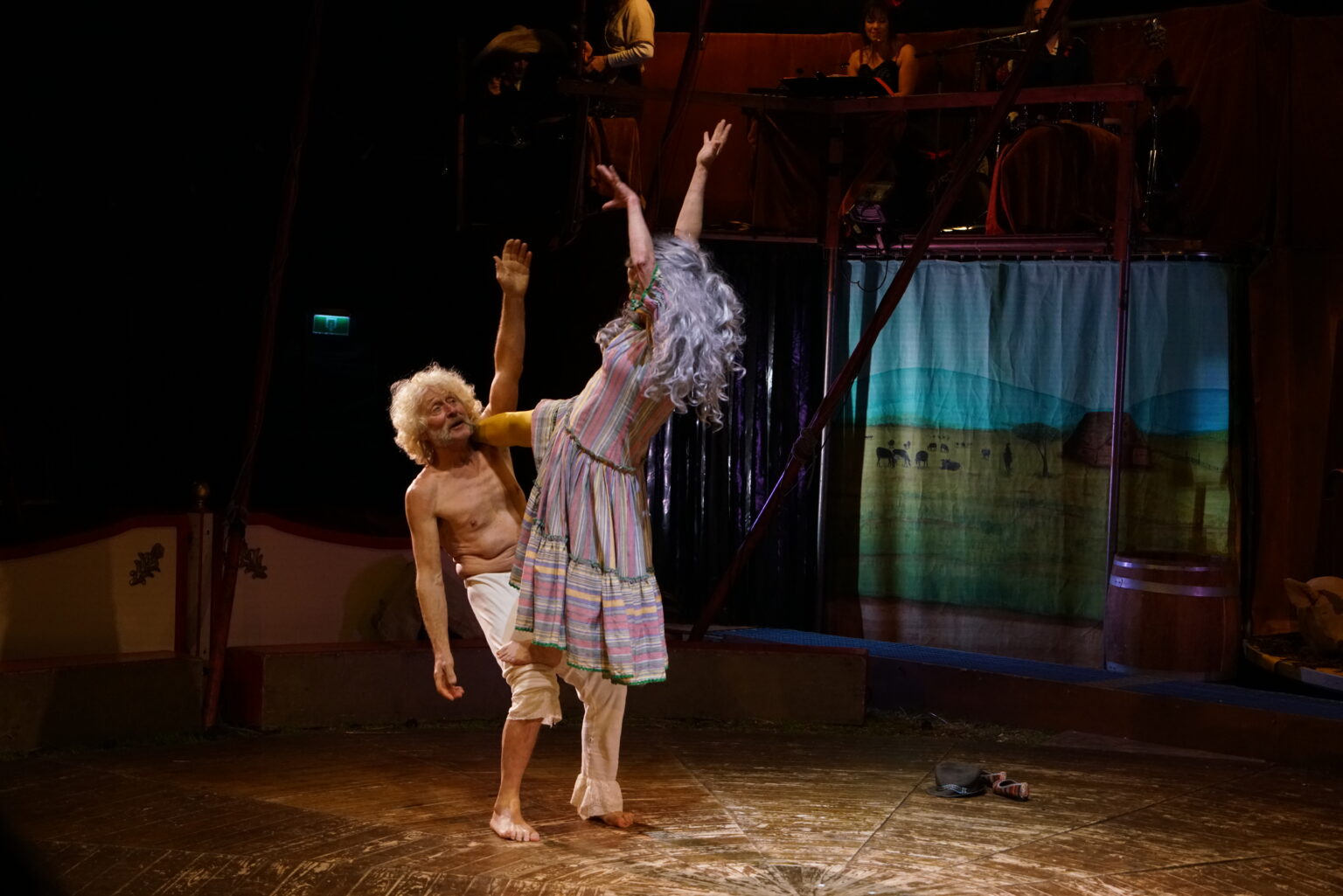 Circus Zanzara geeft ook graag op prachtige wijze een knipoog naar het klassieke circus. Dat gebeurt onder andere met een ‘menselijk paard’, waar zich bovenop een pas de deux afspeelt. En even beeld je je in dat het hierbij gaat om een ‘echt paard’, omdat de bewegingen en het totaalbeeld bijzonder overeenkomen met een echt pas de deux.