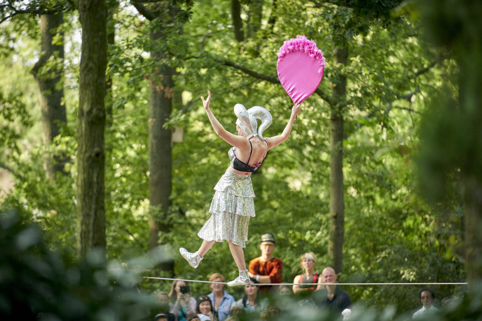 Van de waterkant door naar een veldje in het bos. Levensgrote knuffelbeesten omringen een koord met provisorisch theatergordijntje. Voorbijgangers kijken even verbaasd naar dit opvallende contrast met het vredige park. Maar Amsterdam is Amsterdam, dus ze lopen glimlachend door als Sien van den Acker verschijnt in roze pluchen jurken en glitterpakjes.