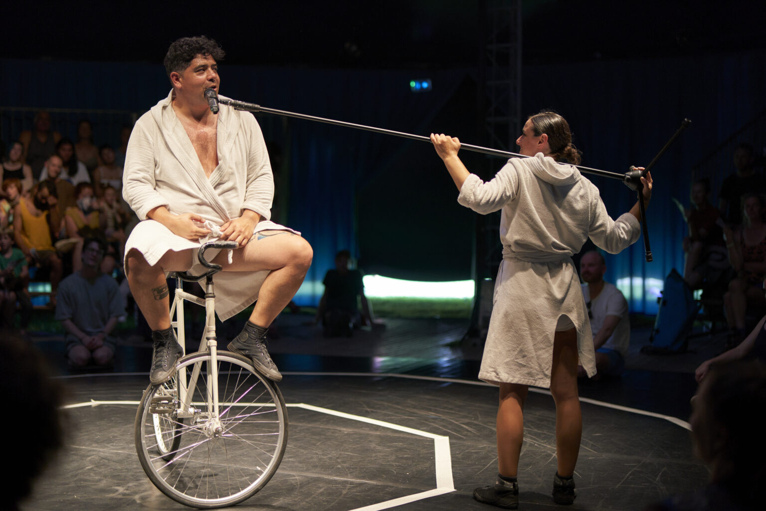 De twee komen de kleine tent binnen, heten het publiek welkom, beginnen dan aan een eerste ronde duo-acrobatiek op de fiets – hun specialisatie. Ronde na ronde klimt en draait zij steeds hoger rond zijn lichaam, bijna vergelijkbaar met een langzame pas de deux te paard. Met een fietsende hand op hand bereiken ze de eerste climax. Vervolgens mogen enkele toeschouwers op de pistevloer plaatsnemen, de rijcirkel stukje bij beetje verkleinend. Het maakt de fietsacrobatiek aanzienlijk moeilijker.