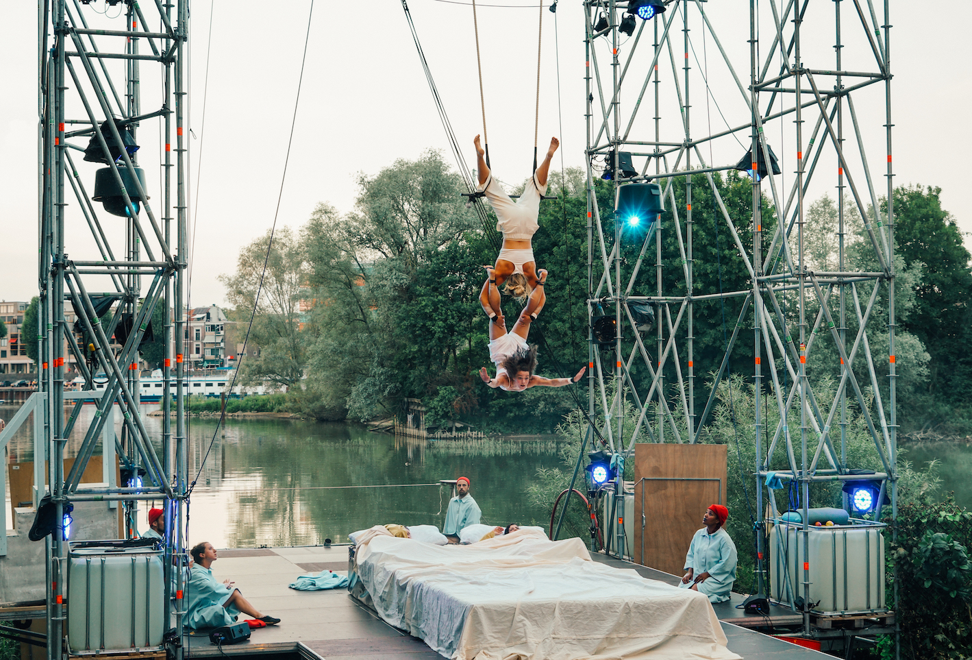 Bewondering is er even later voor Angélique Cabanas en Katherina Dzialas, samen vliegend in een waanzinnige duotrapeze. Het vliegwerk van de dames met de groene omgeving als decor geven je een intens gevoel van vrijheid. Ook het andere werk van Angélique en Katherina is verrassend: zowel Dzialas’ solo-trapeze als de knappe gezamenlijke ikarische spelen-moves.