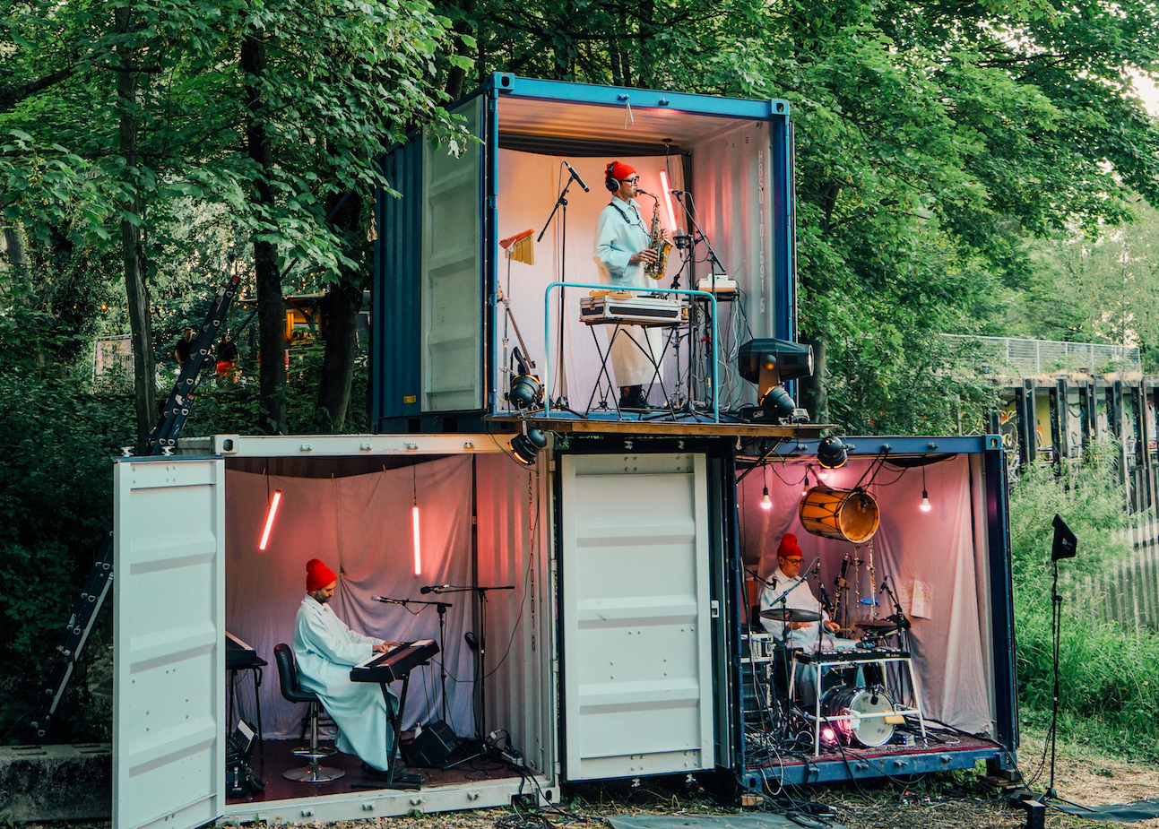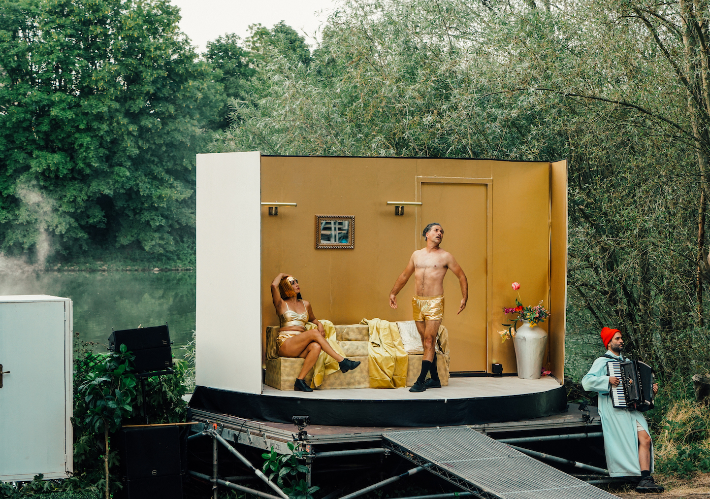 Daar zijn ook de drie muzikanten (Joao Bittencourt, Miguel Boelens en Pim Dros) verantwoordelijk voor. Goede partijen en verfijnde geluiden omlijsten het geheel. Daarbij accenturen de heren ontzettend goed hetgeen op het podium gebeurt. De band is een meerwaarde; zowel statisch zichtbaar in hun containers, als zich mengend in het ensemble.