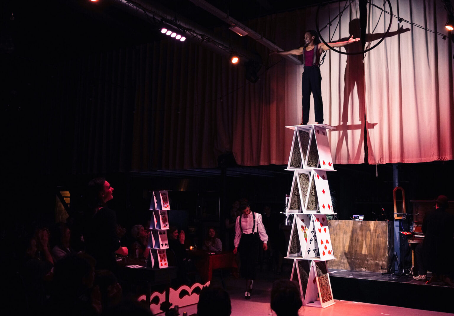 Het creatief bedachte spektakelstuk komt van Salim Musa. Hij bouwt – terwijl Larissa met normale kleine speelkaarten een kaartenhuis op bouwt – een levensgroot kaartenhuis en houdt zichzelf daarbovenop in balans. De verhaallijn uit de voorstelling landt hierbij op een leuke manier, vlak voordat het publiek geniet van het nagerecht.