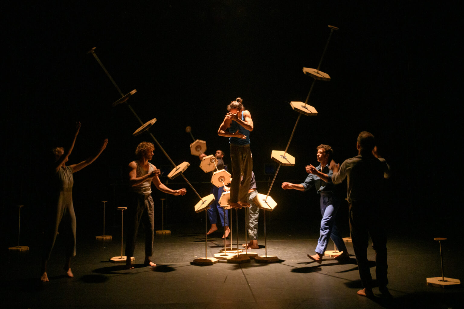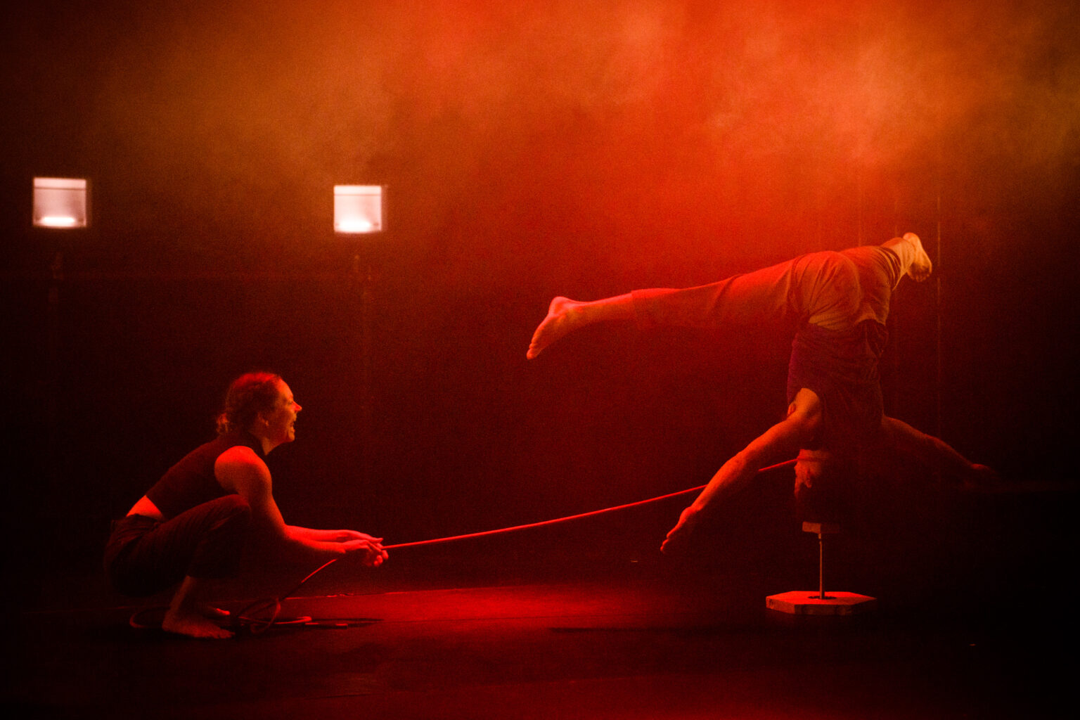 Halverwege de voorstelling worden er met handstandpaaltjes ‘torens’ gebouwd. Als publiek denk je even: gaan de performers daar bovenop balanceren? Maar… vrij abrupt worden de torens omvergeduwd en is het onduidelijk wat het voorgaande bijdraagt aan het voorstellingsverhaal.