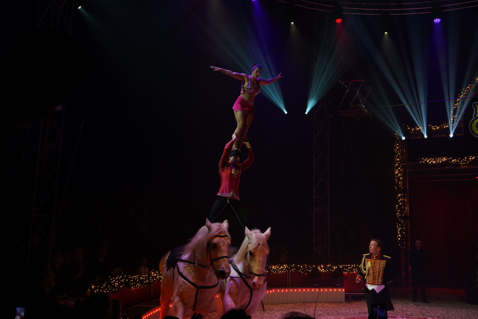 De acrobatisch pas-de-deux op twee paarden van Adrian en Neyenne was wel een hoogtepunt, zo niet dé topact van de avond. De trucs zijn goed – de slottrick is een vrijstaande Neyenne op Adrians hoofd – en het plaatje is prachtig. Dat ‘de circusdirecteur’ Kevin van Geet tijdens de pas de deux met de chambrière in het midden van de piste staat, draagt zeker bij aan dit klassieke circusplaatje.