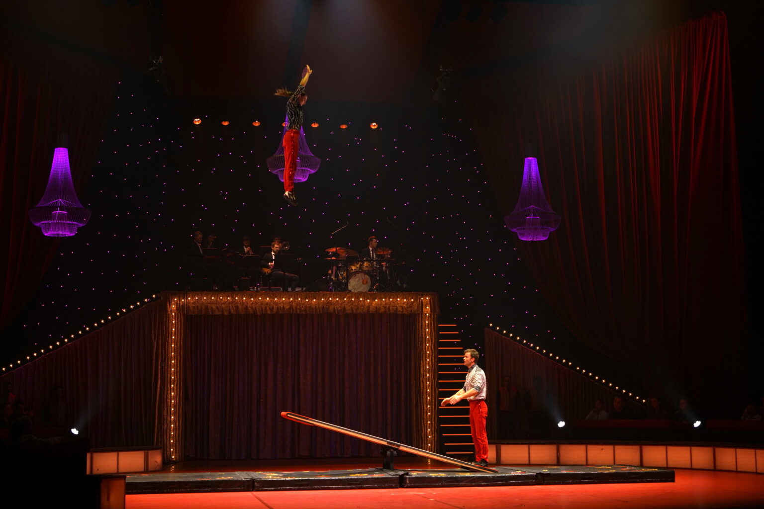 De orkestleden begeleiden het grootste deel van de voorstelling met heerlijke livemuziek. Een hoogtepunt daarvan is bijvoorbeeld de muziek bij de springplankact van ‘Felix & Philo’. Een werkelijk fantastische act van twee mooie artiesten met een geweldige uitstraling. Op het vlak van het circustechnische: eveneens grandioos, onder andere door het steeds hoger gaande springwerk.