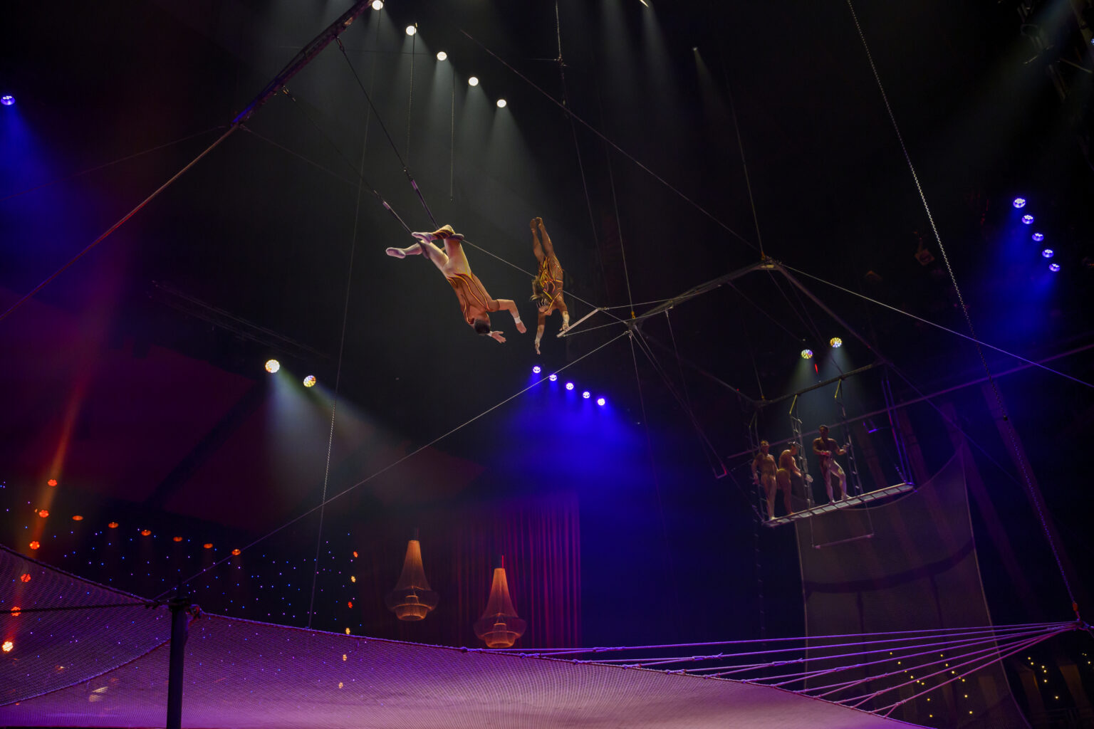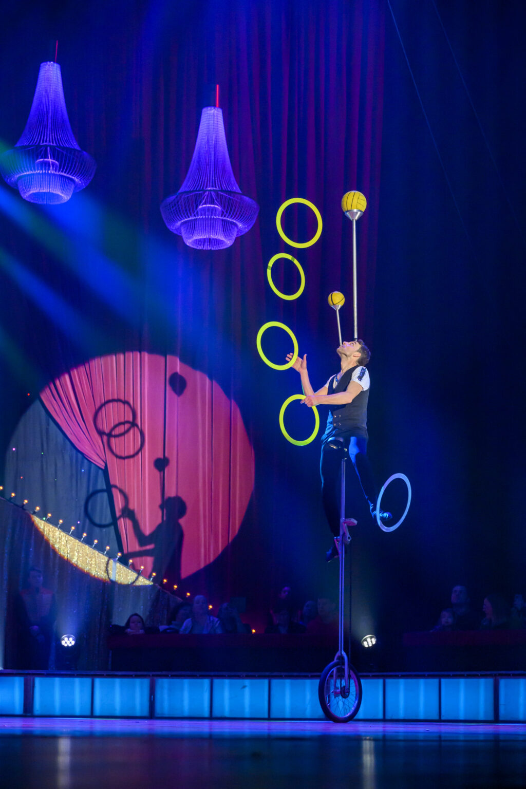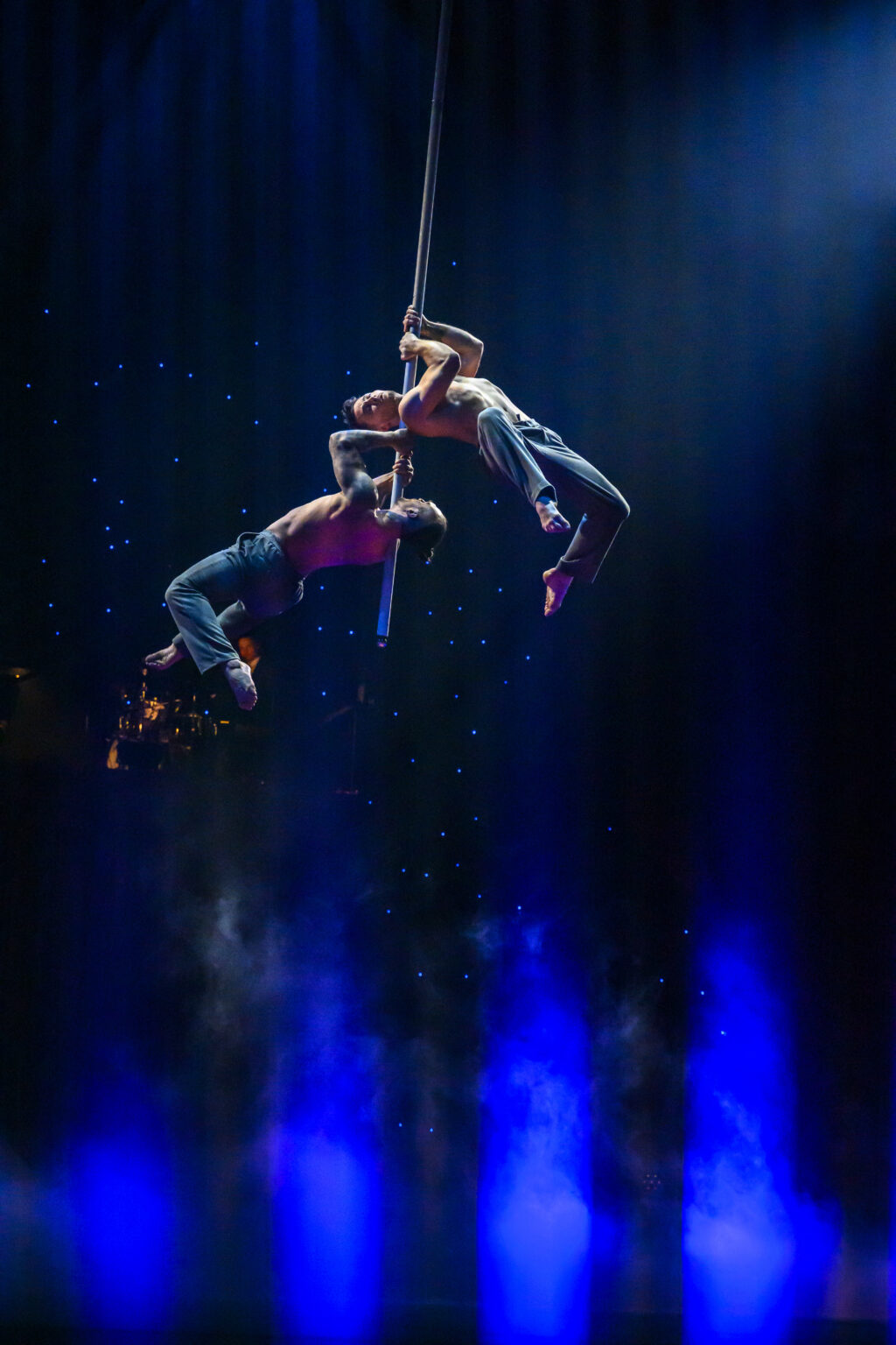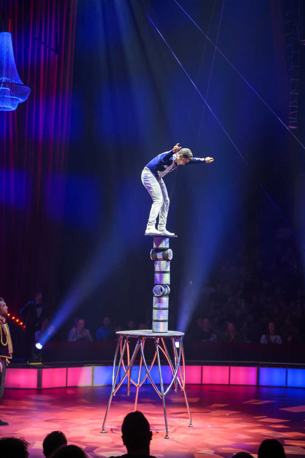 Zo’n vaart, meteen aan het begin van een twee uur durend circus, dat is toch niet vol te houden? Niet voor de artiesten, niet voor de toeschouwers op de tribune. Maar na de pauze is er iets meer rust en verstilling, dat komt de show ten goede. De acts zijn dan verfijnder, uitgebalanceerd én verbluffender, met als hoogtepunten de aerial pole act van Sergiy en Vlad uit Oekraïne en de eenwieleract van de Zweed Erik Ivarsson.