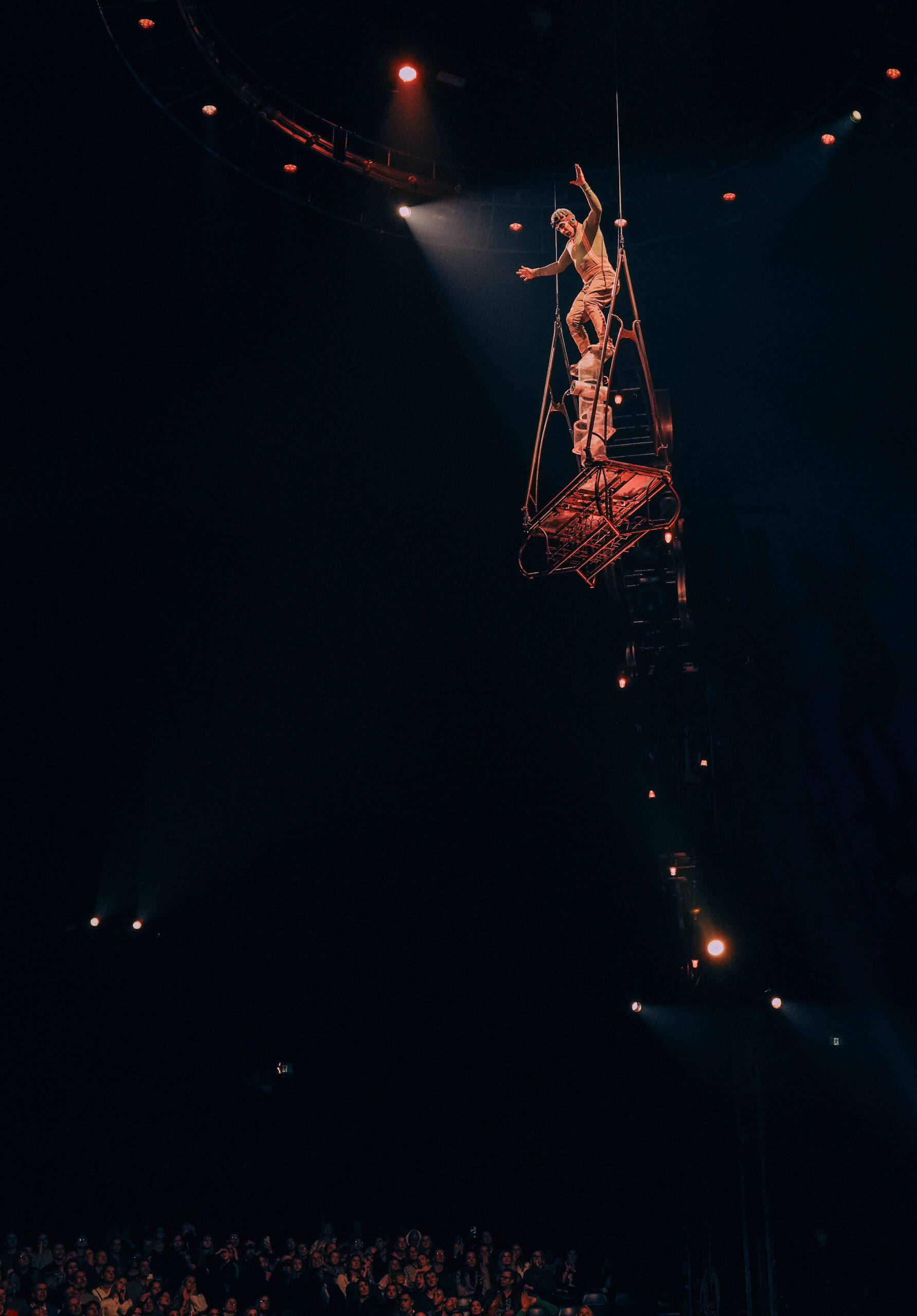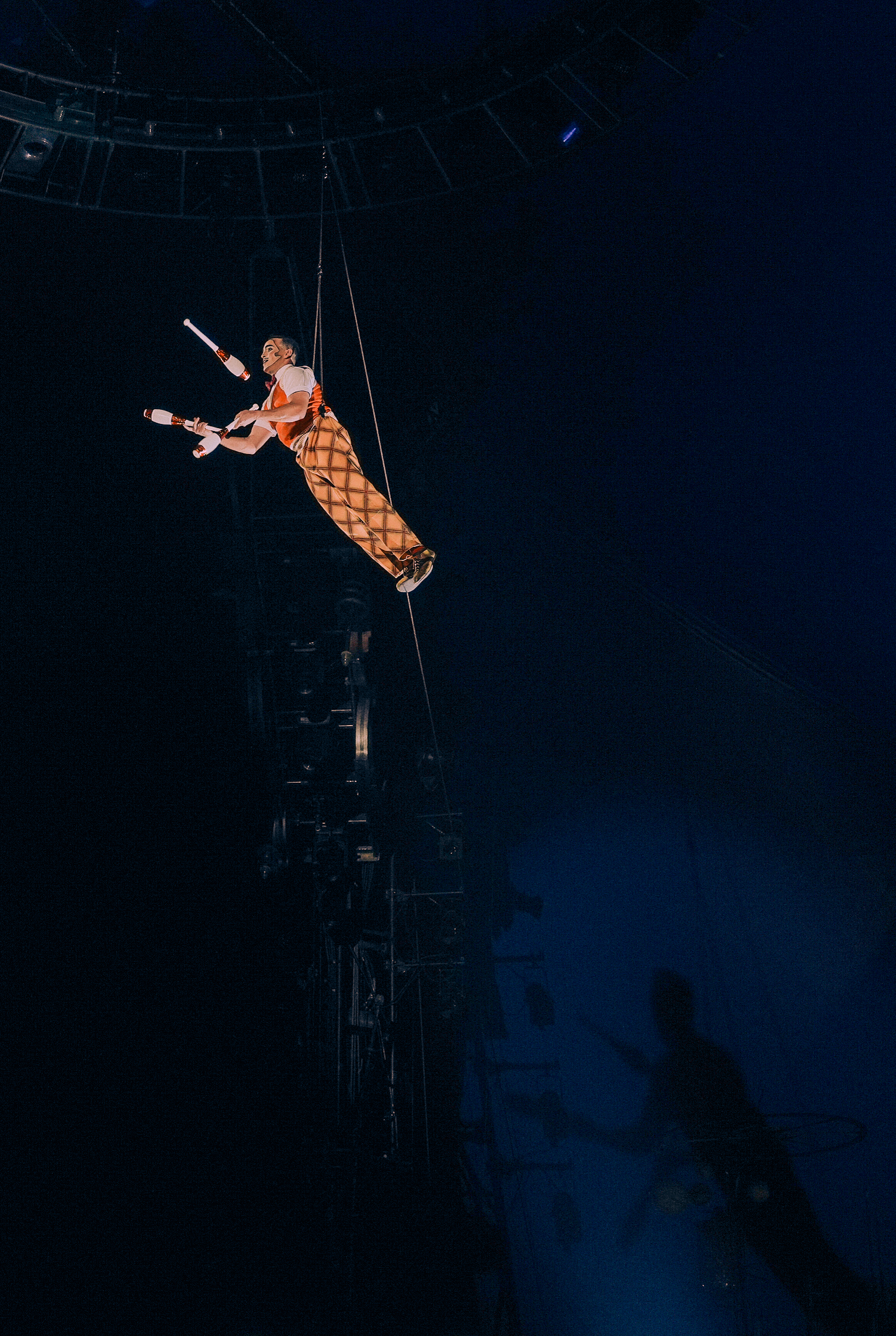 Dan volgt een lyrische, spectaculaire straps-act uitgevoerd door Darian Cobas en Ilya Salmov. De hoogte van de tent wordt optimaal benut: ze vliegen, draaien en zweven door de ruimte alsof de zwaartekracht is afgeschaft.