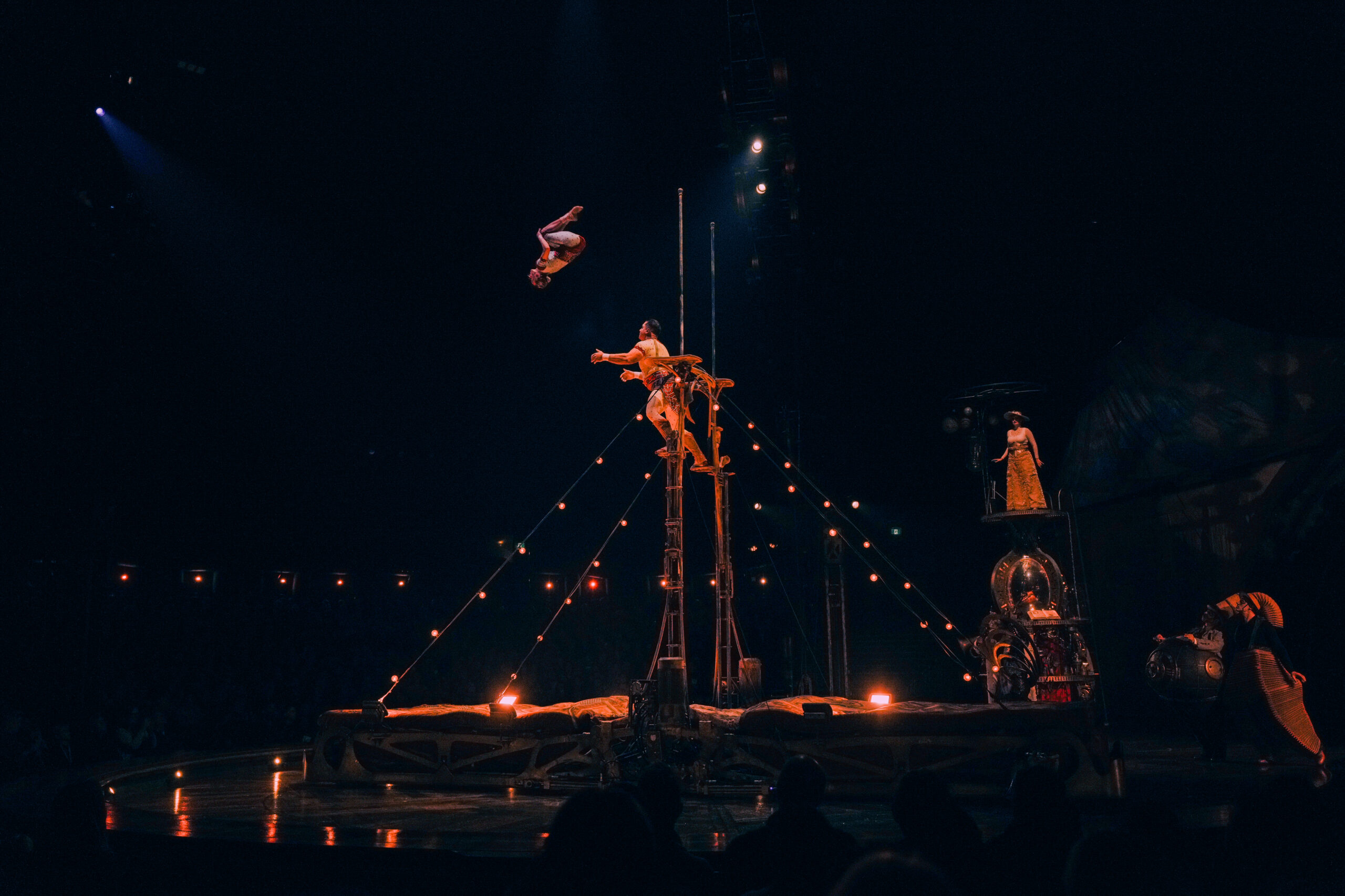 Daarna verplaatst de aandacht zich naar de grond, waar James Gonzalez begint met een klassiekere en creatieve rola rola-act. Wat start als balans op rollen en planken, eindigt uiteindelijk meters in de lucht op een platform. De spanning is voelbaar, de tent houdt collectief de adem in.