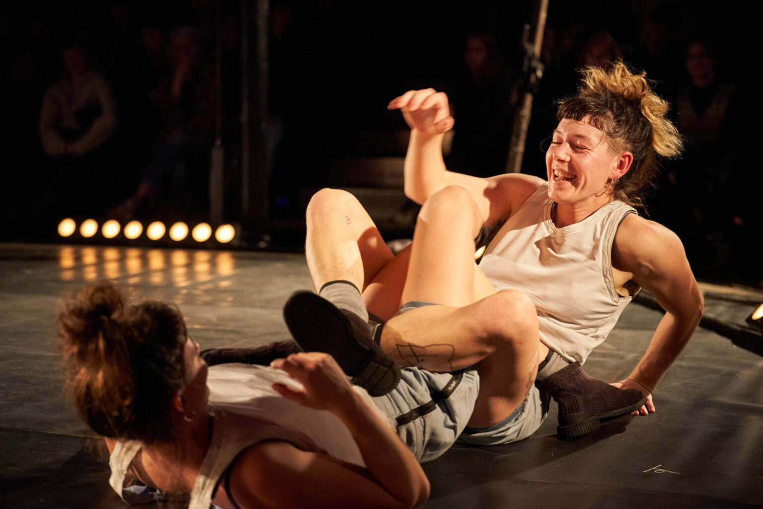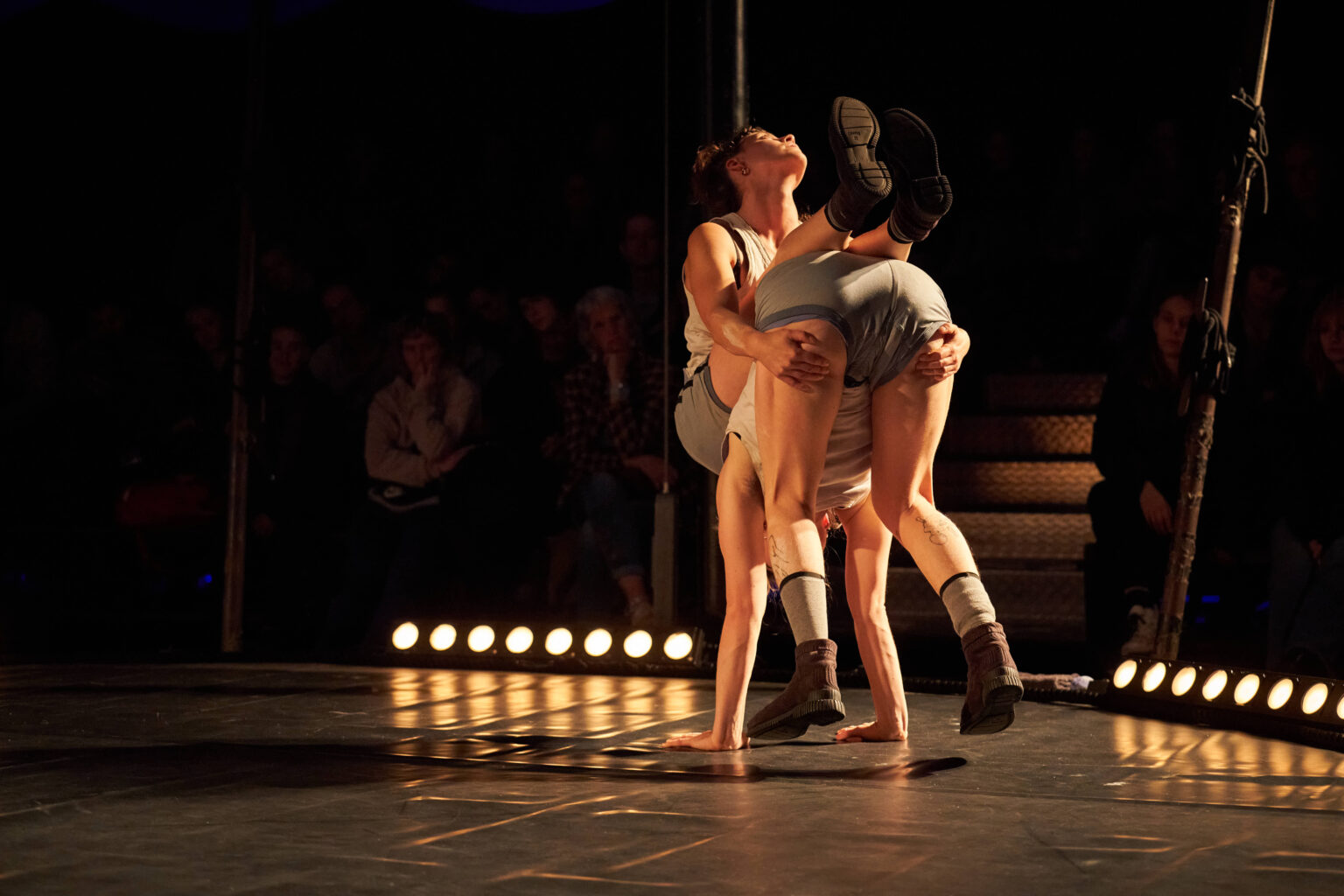 Dit is nog het makkelijke, overzichtelijke deel van de voorstelling. Dat rondjes lopen blijft hetzelfde, bijna een uur lang, maar de manier waarop de twee bewegen verandert en wordt gaandeweg minder transparant. Vaak zijn de benen van de acrobaten verstrengeld, de armen ook, steeds wijzigt de positie.