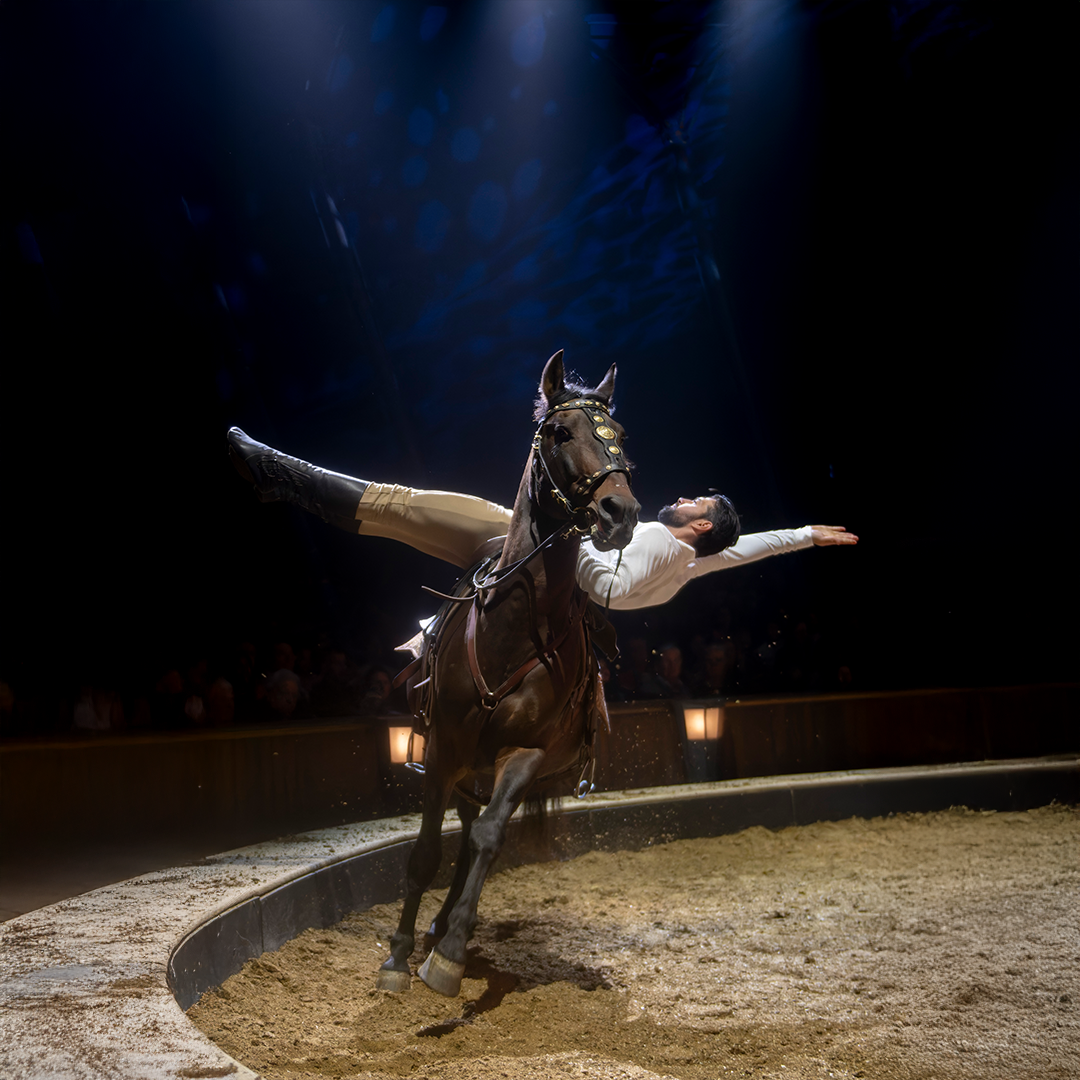 De broers Alexandre en Charles brengen vervolgens indrukwekkend acrobatisch werk op de ruggen van ronddravende paarden. Met precisie en vertrouwen bouwen zij menselijke sculpturen in volle beweging.