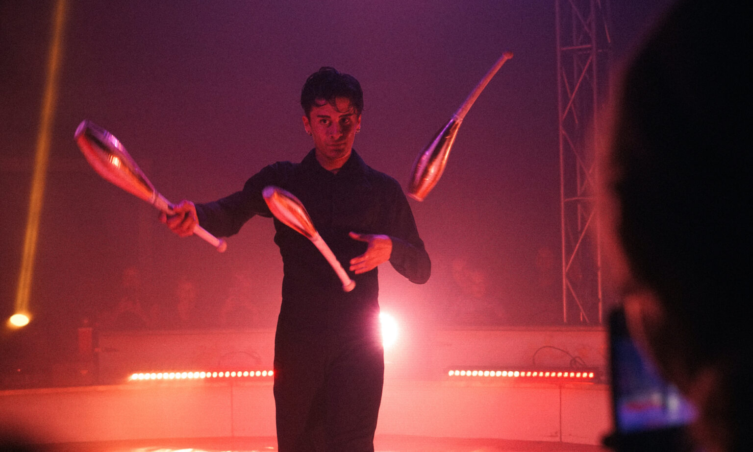 Na Marco Mariani’s solo op de sopraansaxofoon pakt jongleur Miguel Àlvarez Jr. de leiding. Daarmee is iets bijzonders aan de hand. De uitvoering van het jonge Spaanse jongleertalent was op het moment van bezoek allesbehalve vlekkeloos.