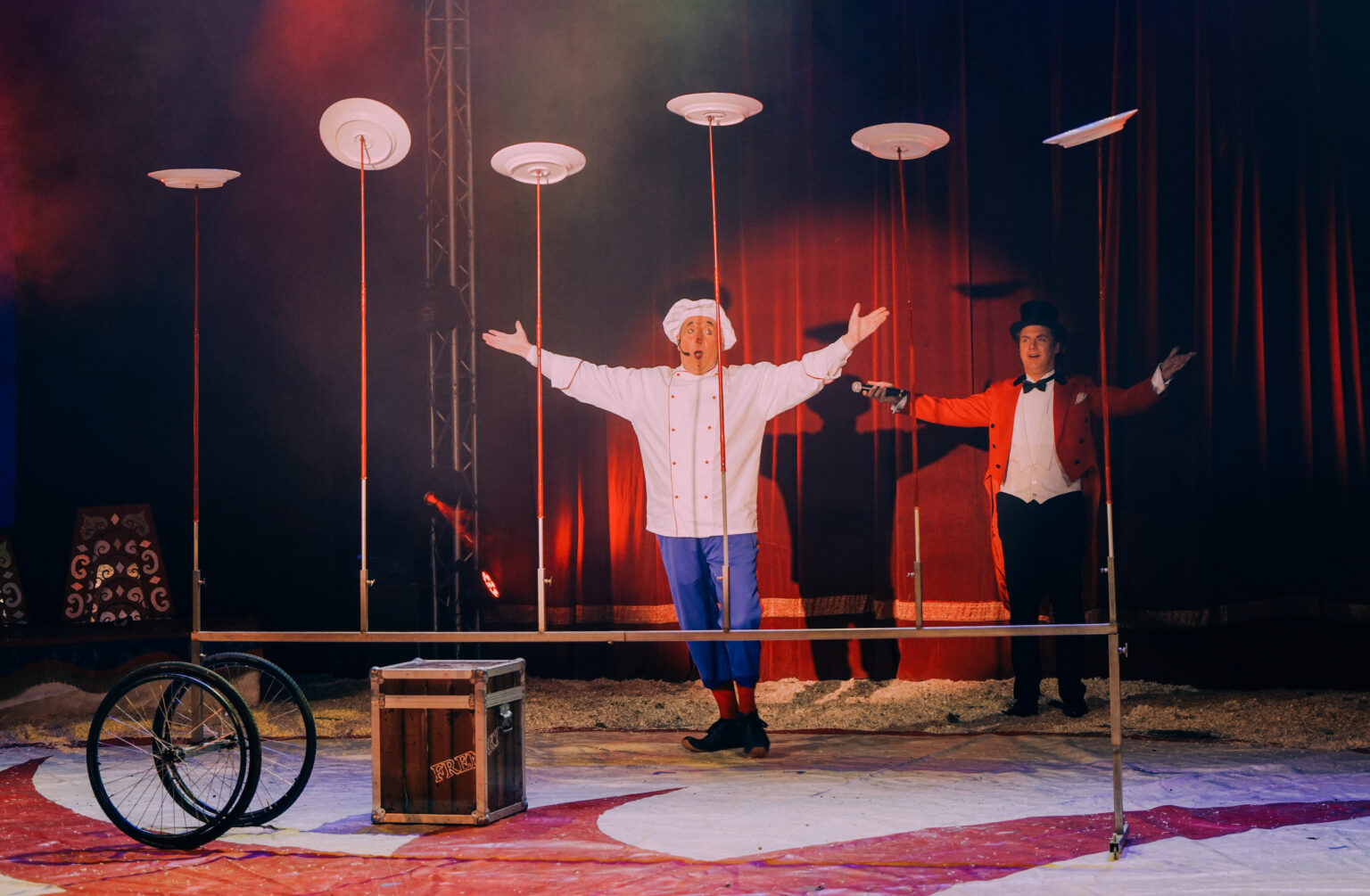 Frenky fiets met komische intermezzo’s tussen de acts door. Dat doet hij samen met Martijn in onder andere een act met ballonnen en in het blok waarbij Frenky borden balanceert op stokjes. Martijn versterkt daarbij het werk van Frenky en visa versa.