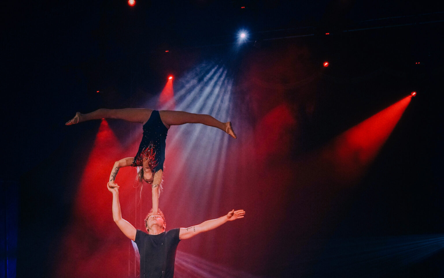 Tof zijn de laatste drie acts in de voorstelling. Eva Novakova zoekt met haar aerial silks enorme hoogtes op. Een sierlijk luchtspel met gevaarlijke stunts.