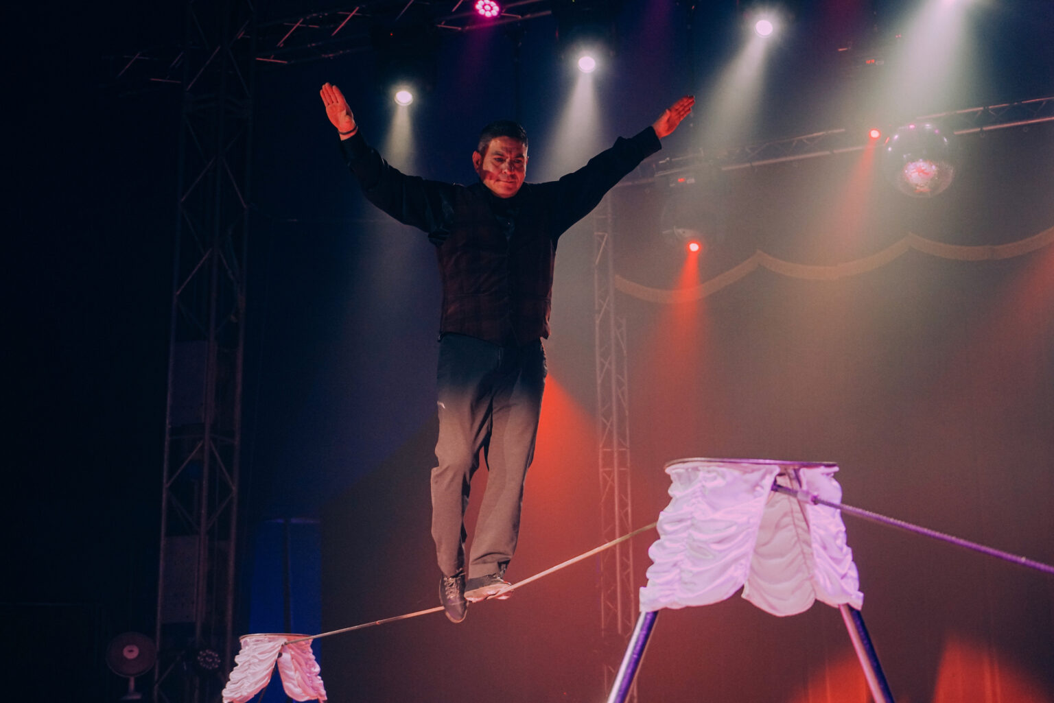 Dat gebeurt dan ook met de act op de strakke draad, gepresenteerd door de goedlachse Oswaldo Ramos. Salto’s op de draad behoren niet tot zijn repertoire. Geen punt, want met een aanstekelijk enthousiasme zet de rasartiest echt een onvervalste leuke klassieke circusact neer. Moderner is Oswaldo’s werk later in de voorstelling: de act met laserlichten.