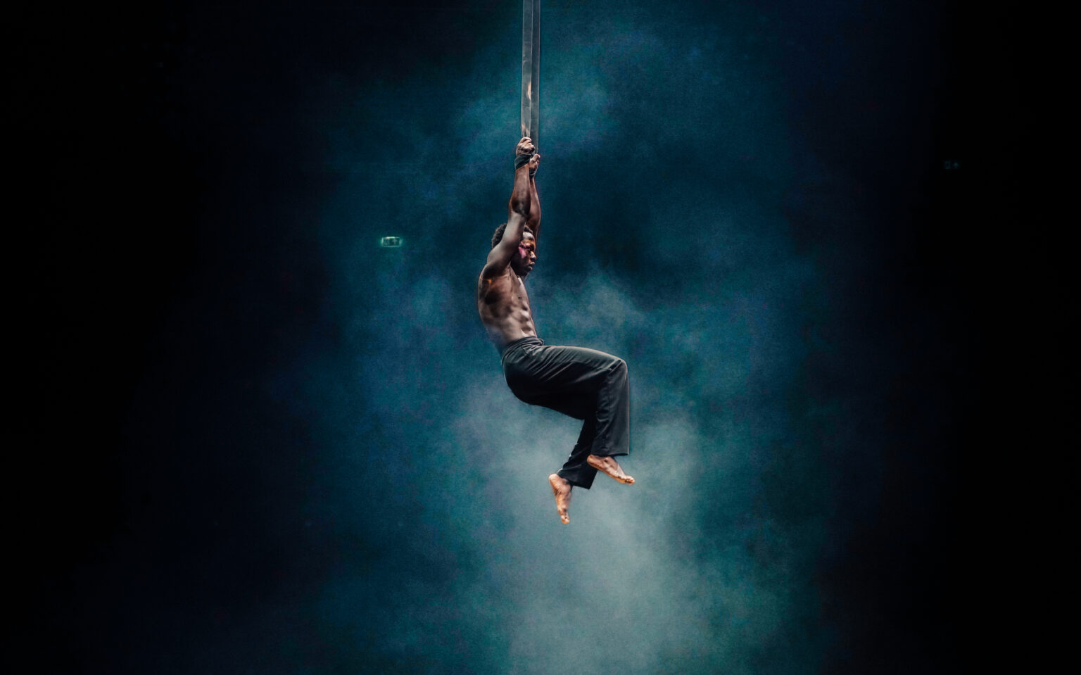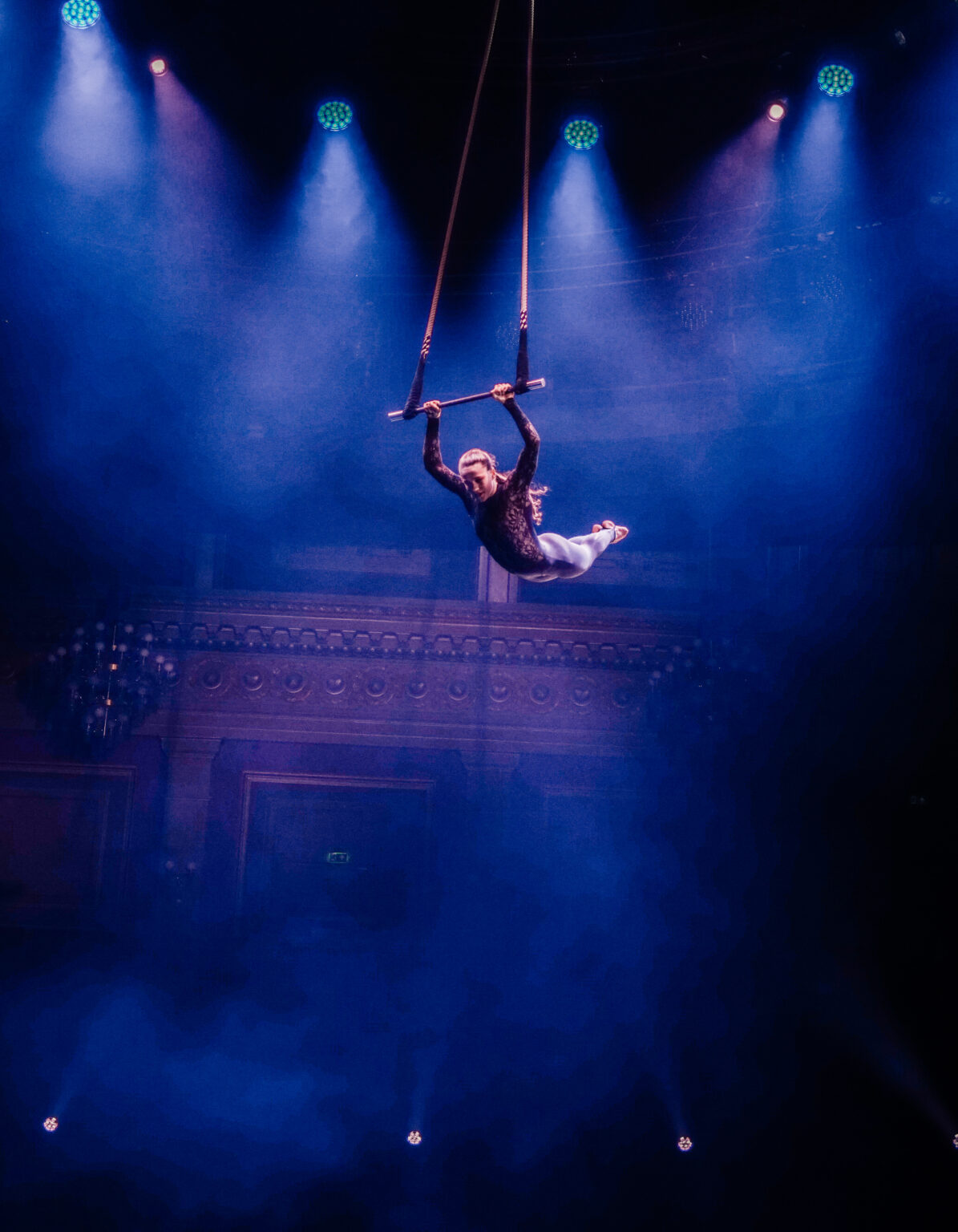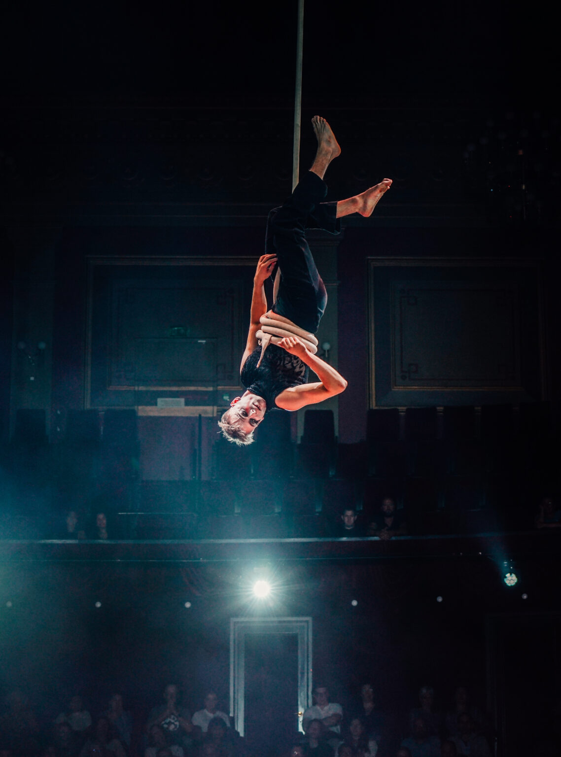Joe Baker wordt aan een dik koord met immense snelheid boven het podium heen en weer getrokken. Even later beklimt hij op enorme hoogte zijn aerial rope. Een waanzinnige en spectaculaire circusact, die je écht zweterige handjes bezorgt.