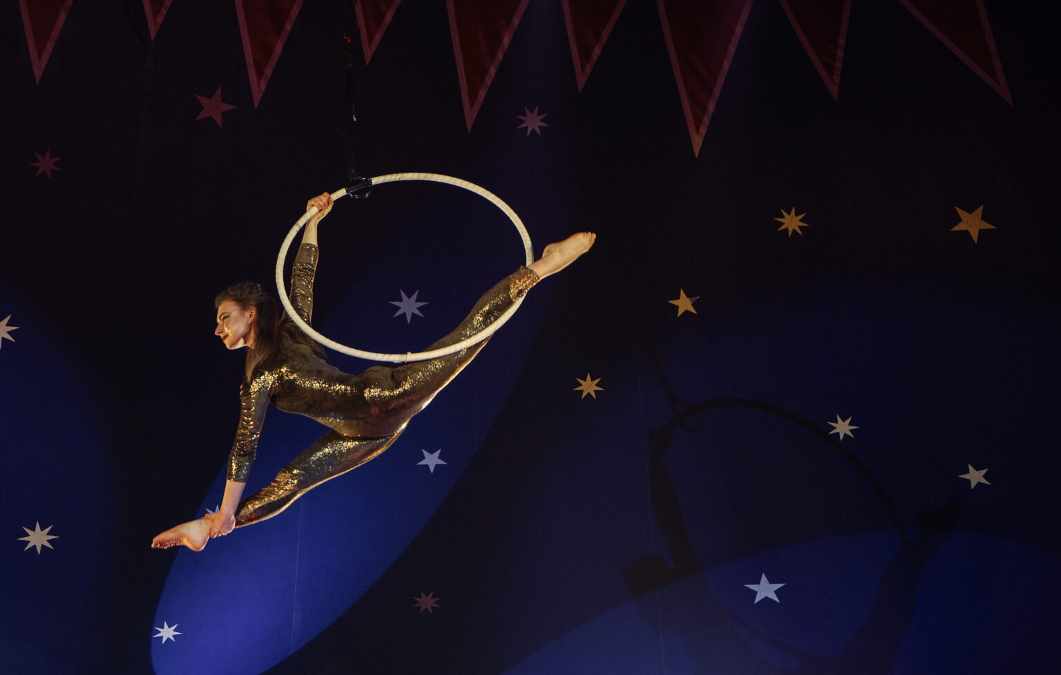Gefascineerd aanschouwt het publiek ook de luchthoepel van de Oekraïense Yulia. Knappe poses op grote hoogte en sfeervolle verlichting maken er een mooi geheel van.