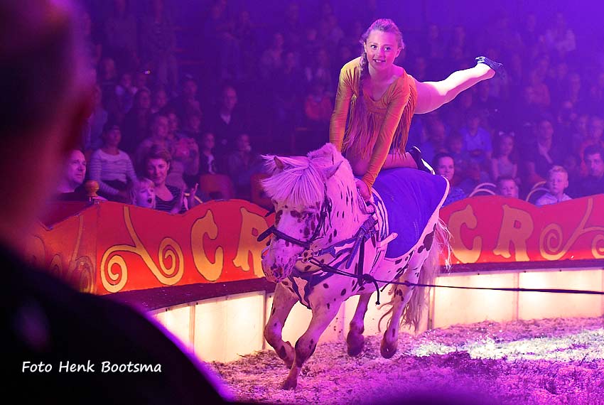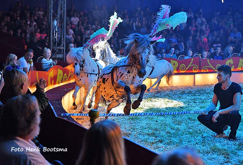 Paarden zijn volop aanwezig met vrijheidsdressuren van 4 Friese hengsten/ 1 Arabier en 4 pony’s beide door Henrico Frank, 3 vurige veel steigerende Arabieren voor-gebracht door Bernard Renz Jr., Jockeyreiterij door de jeugdige Shakira en een mooie hogeschool op een Andalusiër van Madeleine Renz.