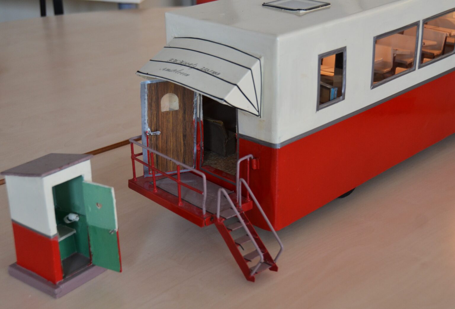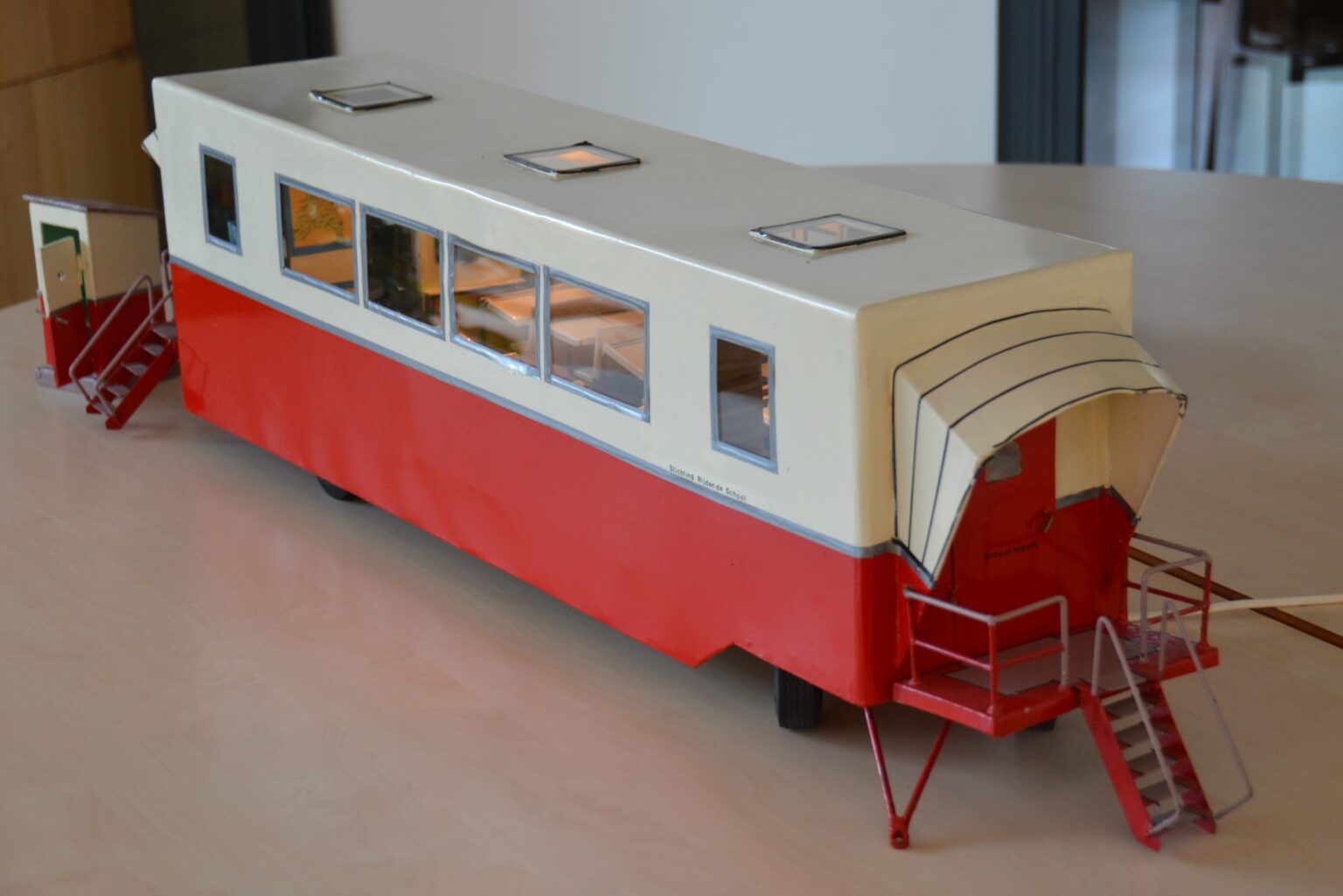 Stichting De Rijdende School bezit dit model van één van de rijdende scholen zoals die in 1956 in gebruikt werd. Het model is in 1999 met de hand gemaakt door de heer F.W. Kopatz in Amstelveen. Hij dateerde en signeerde het model en schonk het aan ‘De Rijdende School’.