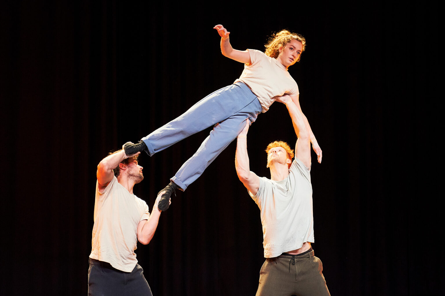 De drie artiesten van ‘Knot on Hands’ blijven in hun voorstelling ‘Brace for Impact’ met grondacrobatiek dicht bij moderne dans. Ze tonen ook traditioneler ogender circuswerk: salto’s, handstanden en het ‘gooien’ met elkaar. De schoonheid zit in de souplesse en de organische samenhang van bewegingen. Dat alles wordt uitgevoerd op minimale muziek en zonder objecten en decor.