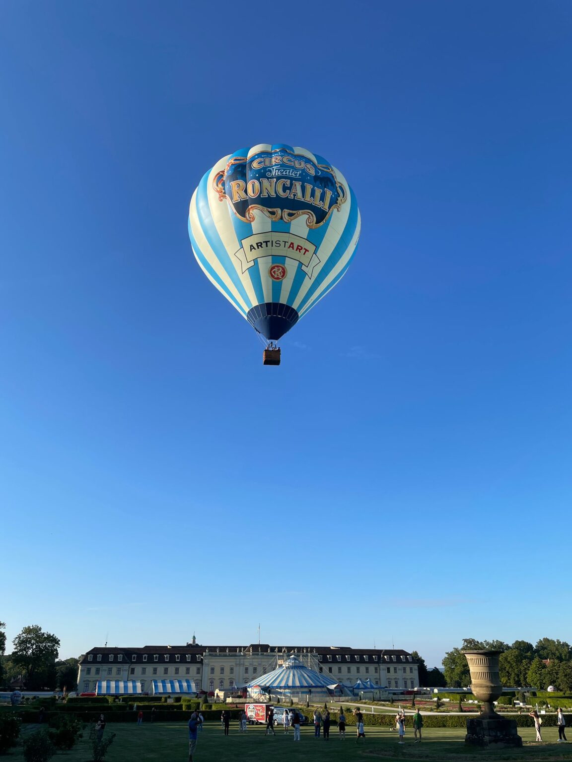 Roncalli staat daar opgebouwd op het groene terrein ‘Blühendes Barock’. Maandagavond 5 augustus steeg de luchtballon voor de eerste keer op.