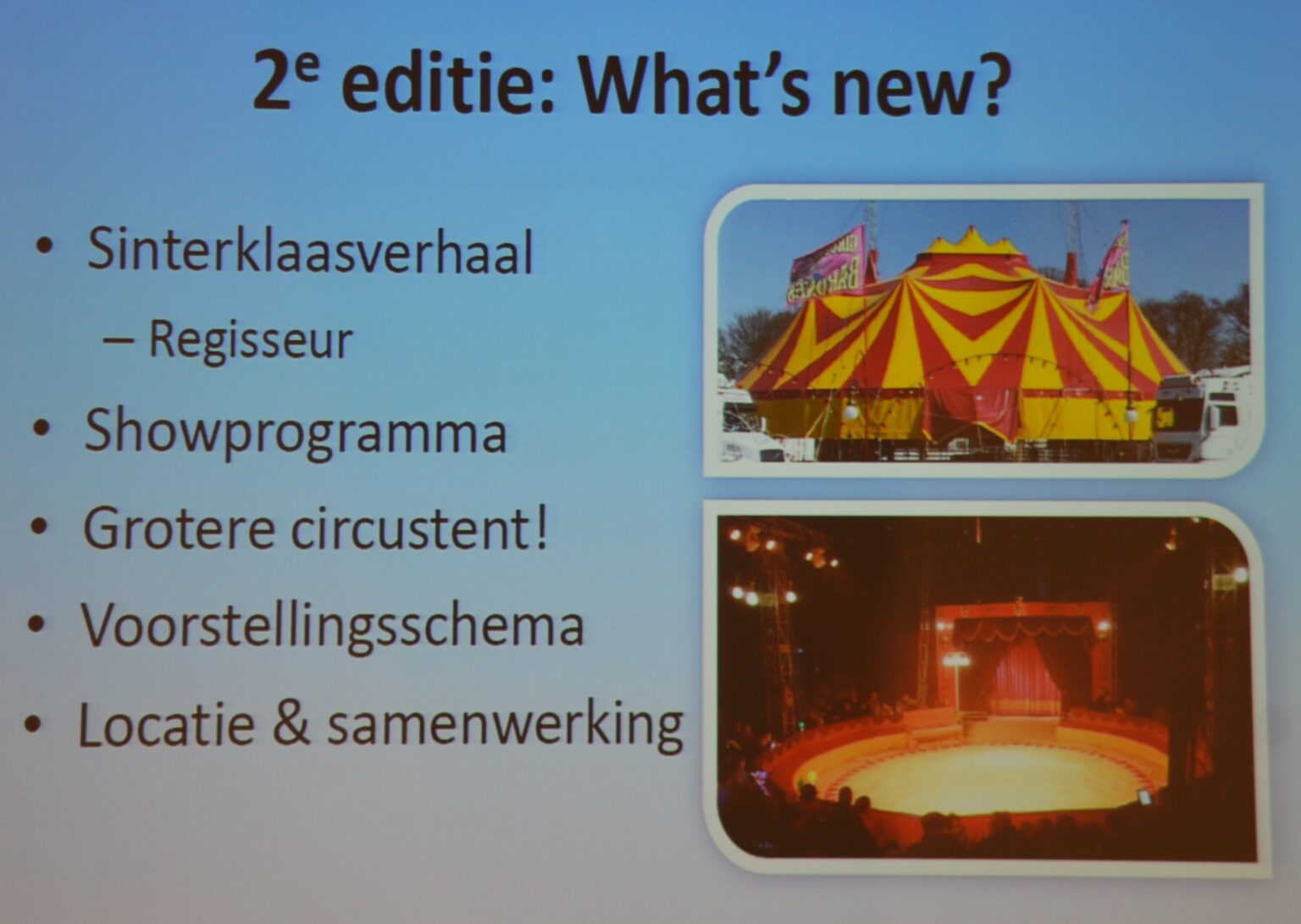 Maar wat iedereen vooral wil weten: hoe gaat de editie 2017 er uit zien? In ieder geval wordt gespeeld in een aanzienlijk grotere tent, plaats biedend aan 700 bezoekers. Op welke locatie die komt te staan is nog niet bekend: de Markt is een sprookjesachtig mooie plek maar heeft ook veel nadelen. Zeker is wel dat Sinterklaas weer de hoofdrol speelt in een eigen verhaallijn, dat clown Davy weer van de partij is en dat het publiek dieren te zien krijgt. Dieren waarvan het welzijn gegarandeerd is.