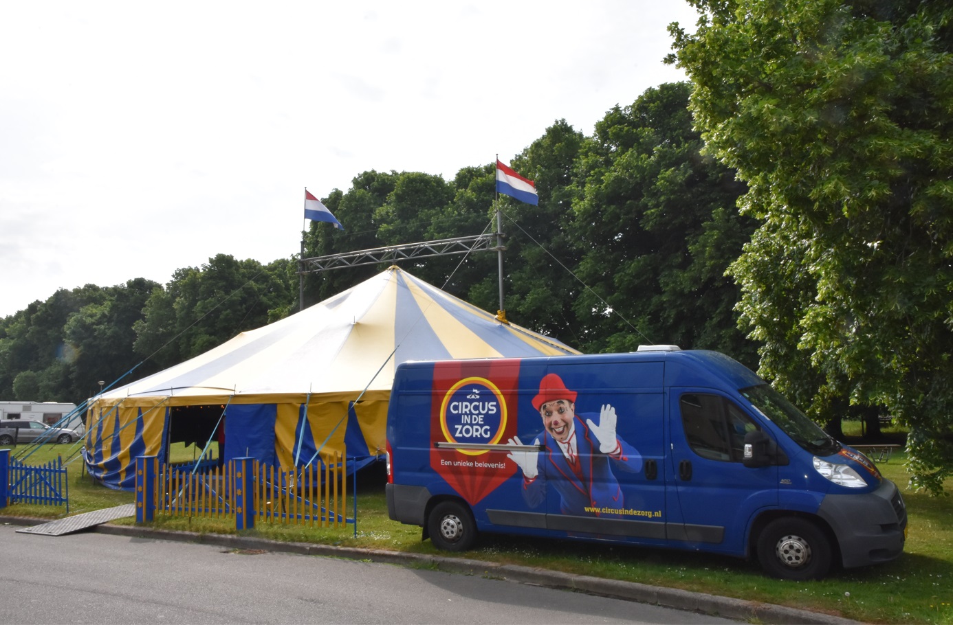 Een fantastisch circus concept is circus in de zorg. Zorginstellingen kunnen een aantal circus voorstellingen uitkopen voor hun cliënten. Vanochtend maakte ik een van de drie voorstellingen mee in Amby op het terrein van De Zevenbronnen. De weersvoorspellingen waren gespannen want tegen de middag kans op zwaar onweer waarvoor code oranje is afgegeven. Dat betekent dat de eerste voorstelling van 11.00 u nog in de tent kon worden gegeven voor ongeveer 80 rolstoelbezoekers. De twee andere voorstellingen worden vanwege de slechte weersvoorspelling binnen in de zorginstelling gegeven. Dus een dag met nogal improvisatie werk.
