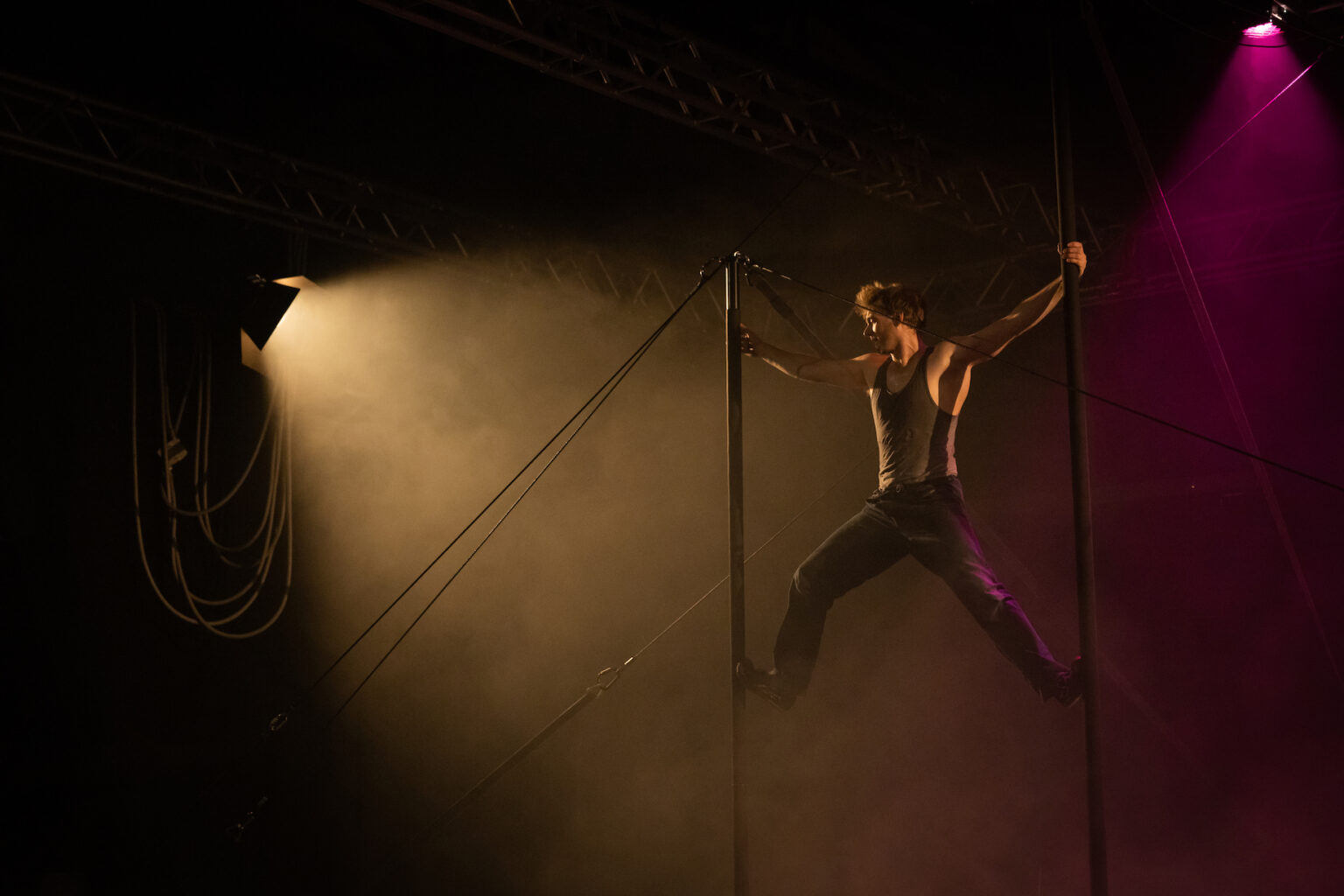 Wat gebeurt er op een podium nadat de show is afgelopen? Dan gaat de spot uit en het ghost light aan. Dit markeert het einde van het optreden van mensen en het begin van wie of wat het nachtelijke podium wil betreden. In Hold on light verenigen drie artiesten de uitersten van hun circuspraktijken. Ze nemen je mee naar een plek waar verschillende realiteiten bestaan en routines, wetten en fysica langzaam uit elkaar lijken te vallen.