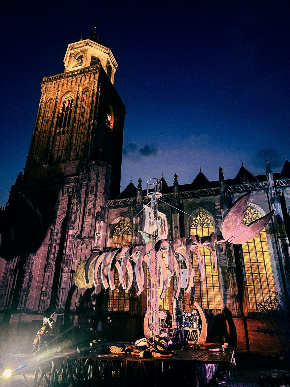 De voorstelling speelde naast de kerk (Grote Kerkhof) en een groot ensemble van acteurs, acrobaten en muzikanten vulde het podium. Het zat bij ‘m bij Moby Dick vooral in het effect, omdat de gesproken tekst lastig te volgen was. Maar dat effect was groots en het totaalbeeld ademde ambachtelijkheid en kwaliteit. In de voorstelling creëerden de spelers eerst het enorme geraamte van een schip, waarna even later dat geraamte andersom getakeld werd en er het geraamte van een walvis – Moby Dick – ontstond.