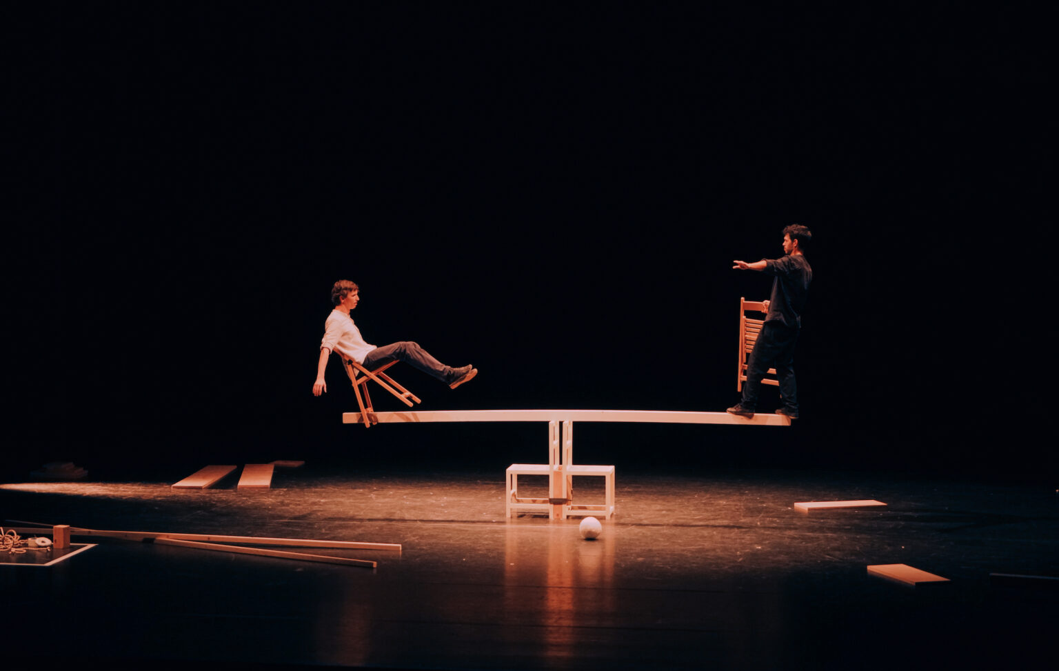De voorstelling sloot af met de knappe balansbeweging, waarbij beide heren aan het einde van de plank balanceren op twee houten stoeltjes.