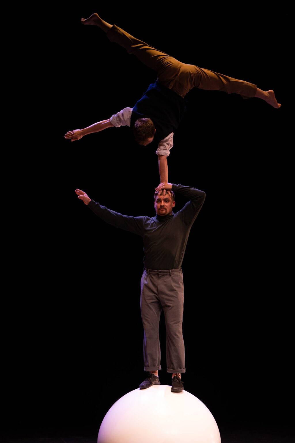Malte & Bene, bekend als het duo Hand2Globe, betreden het podium met een immense witte bal. In hun acht minuten durende act combineren de jongens/ goede vrienden spectaculaire partneracrobatiek met deze ‘rollende wereldbol.’