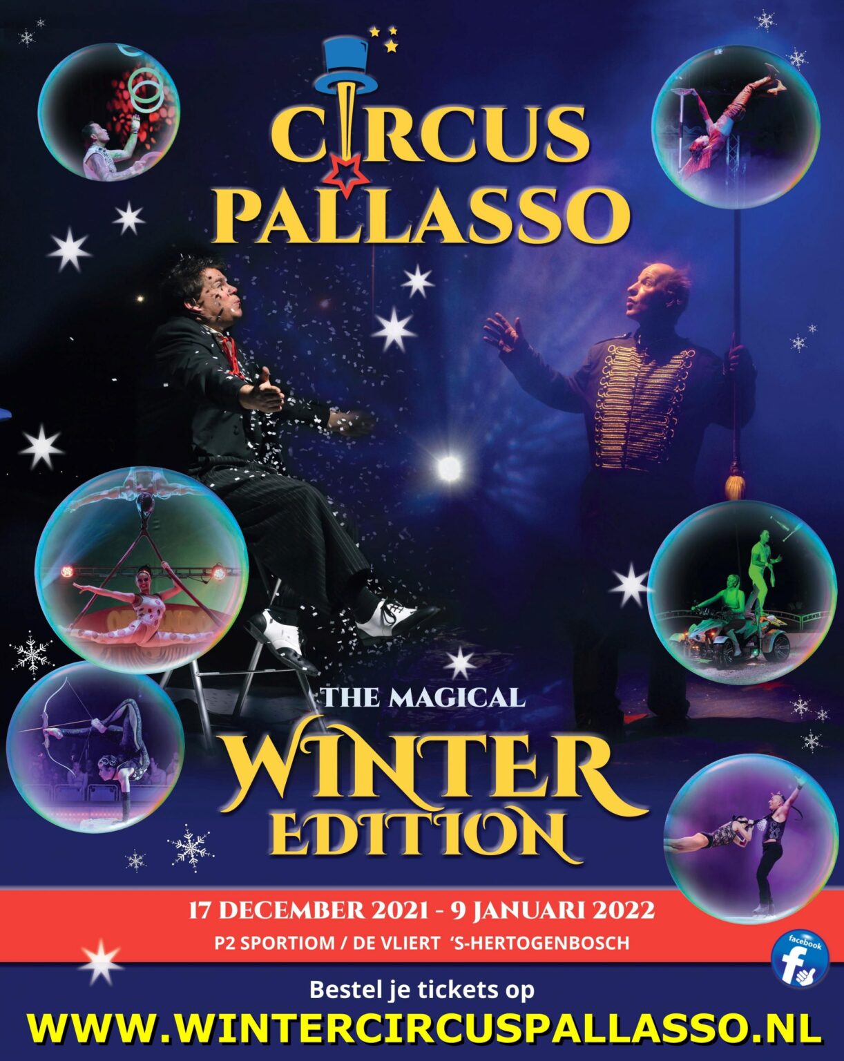 Wintercircus Pallasso strijkt van 17 december 2021 tot en met 9 januari 2022 voor een serie bruisende voorstellingen neer op P2 bij het Sportiom exclusief in ’s-Hertogenbosch: The Magical Winter Edition!