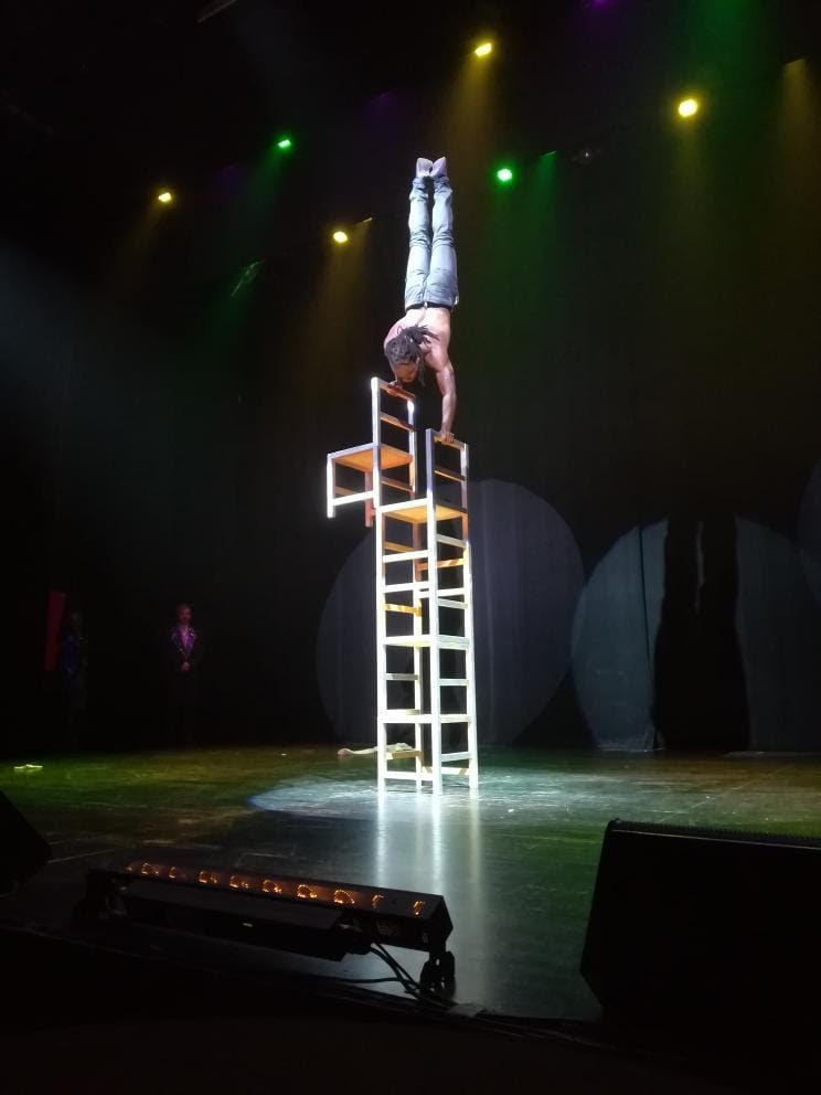 Colins Ouma is geboren en getogen in Kenia. Inmiddels woont hij in Nederland, maar treedt hij nog steeds op met de bijzondere acrobatiek act die hij daar leerde. Met een indrukwekkend evenwicht manoeuvreert hij zich over gestapelde stoelen en bereikt hij zo de nok van het theater.